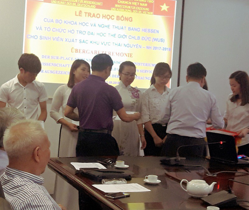 Nhằm tuyên dương và hỗ trợ sinh viên nghèo vượt khó học giỏi, đồng thời chia sẻ, giúp đỡ các em vượt lên khó khăn trong học tập và cuộc sống, ngày 11/05/2018, văn phòng Hessen tại Việt Nam phối hợp với Trường Đại học Thái Nguyên tổ chức Lễ trao học bổng của Bộ Khoa học và Nghệ thuật bang Hessen (HMWK) và Tổ chức Hỗ trợ Đại học Thế giới CHLB Đức (WUS) năm học 2017-2018 cho 24 sinh viên xuất sắc của các trường đại học, cao đẳng trong khu vực Thái Nguyên.