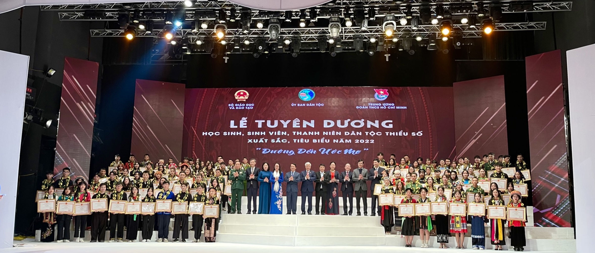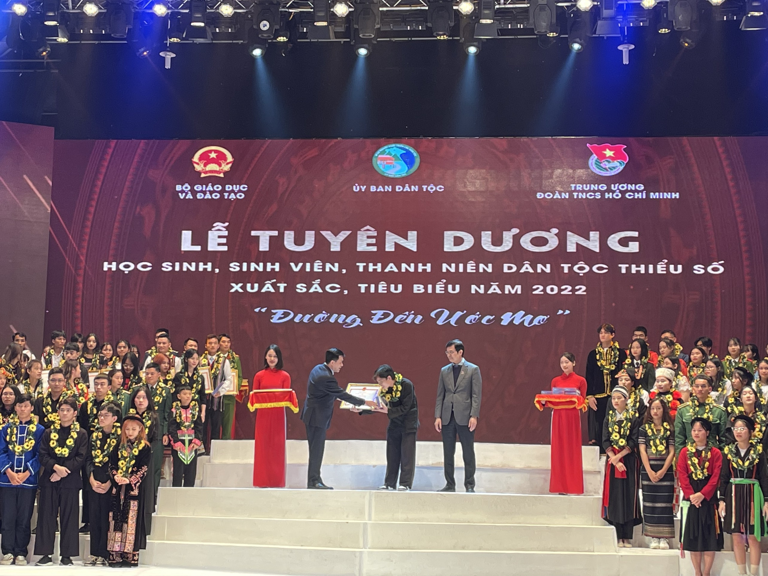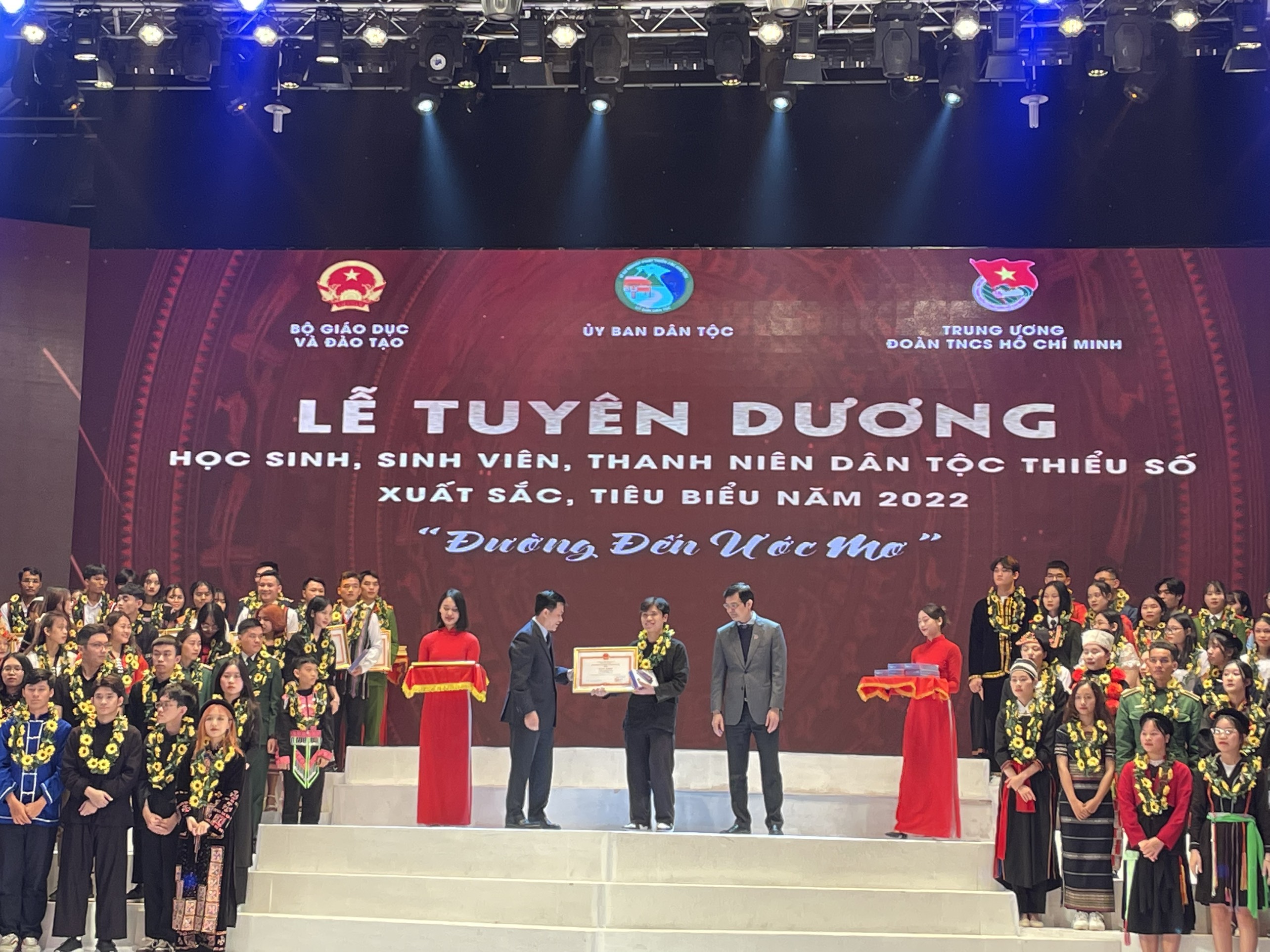 Tối 10/12/2022, Lễ Tuyên dương học sinh, sinh viên và thanh niên dân tộc thiểu số (DTTS) xuất sắc, tiêu biểu năm 2022 đã diễn ra tại Nhà hát Âu Cơ, Hà Nội. Đây là lần thứ 9, Ủy ban Dân tộc phối hợp cùng Bộ Giáo dục và Đào tạo, Trung ương Đoàn TNCS Hồ Chí Minh tổ chức chương trình gặp mặt, tuyên dương học sinh, sinh viên và thanh niên DTTS xuất sắc, tiêu biểu năm 2022.