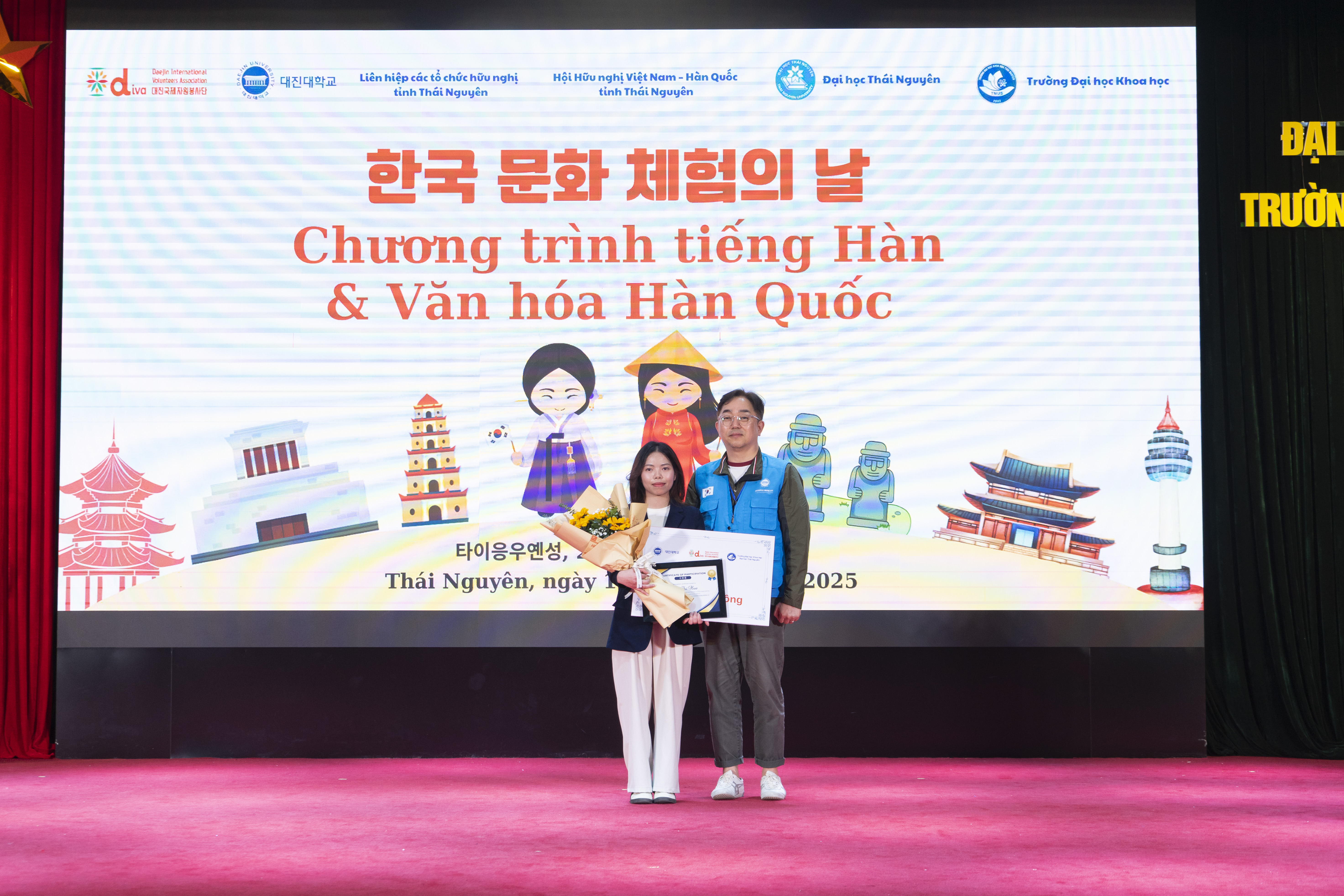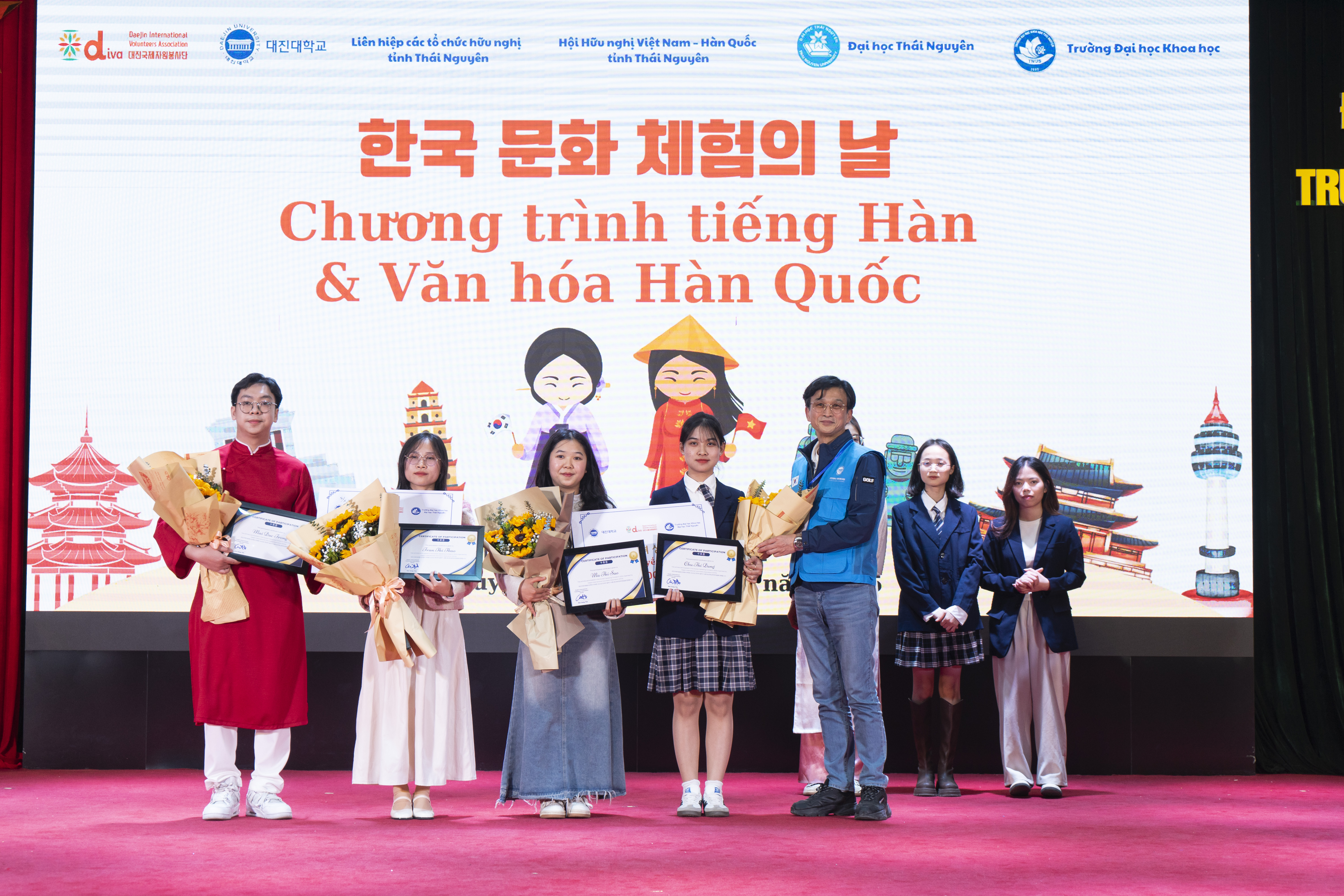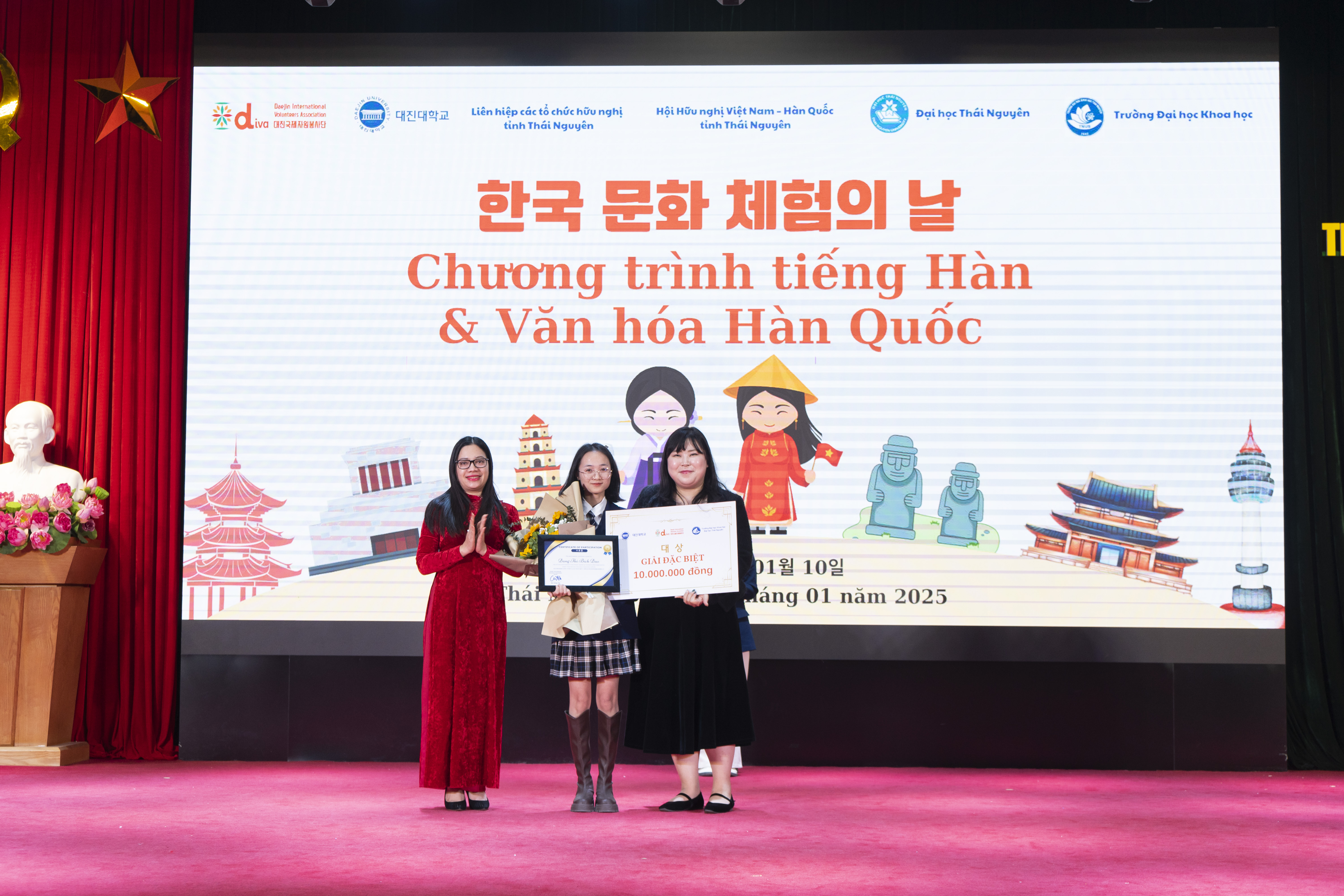 Điểm nhấn của chương trình là cuộc thi nói tiếng Hàn. Cuộc thi không chỉ là sân chơi trí tuệ nơi sinh viên thể hiện tài năng và niềm đam mê ngôn ngữ Hàn Quốc mà còn là cơ hội để các bạn sinh viên ngành Hàn Quốc học học hỏi, cọ xát kỹ năng thuyết trình, tranh biện bằng tiếng Hàn trong môi trường quốc tế. Với sự chuẩn bị kỹ lưỡng, nội dung thuyết trình sáng tạo cùng sự tự tin, sinh viên Đặng Thị Bích Đào – Lớp Hàn Quốc học K20B - Trường Đại học Khoa học đã xuất sắc giành được giải Đặc biệt và sinh viên Trần Thị Huệ - Lớp Hàn Quốc học K19B đã giành giải Nhì; 02 giải khuyến khích. Đây là minh chứng cho sự nỗ lực không ngừng trong học tập và rèn luyện của các bạn, đồng thời khẳng định chất lượng đào tạo ngành Hàn Quốc học tại nhà trường.