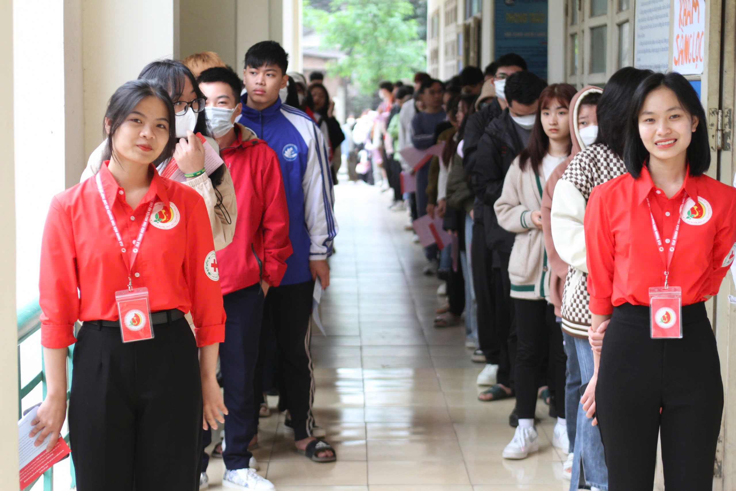 Ảnh 1: Hàng người xếp hàng dài chờ khám để hiến máu