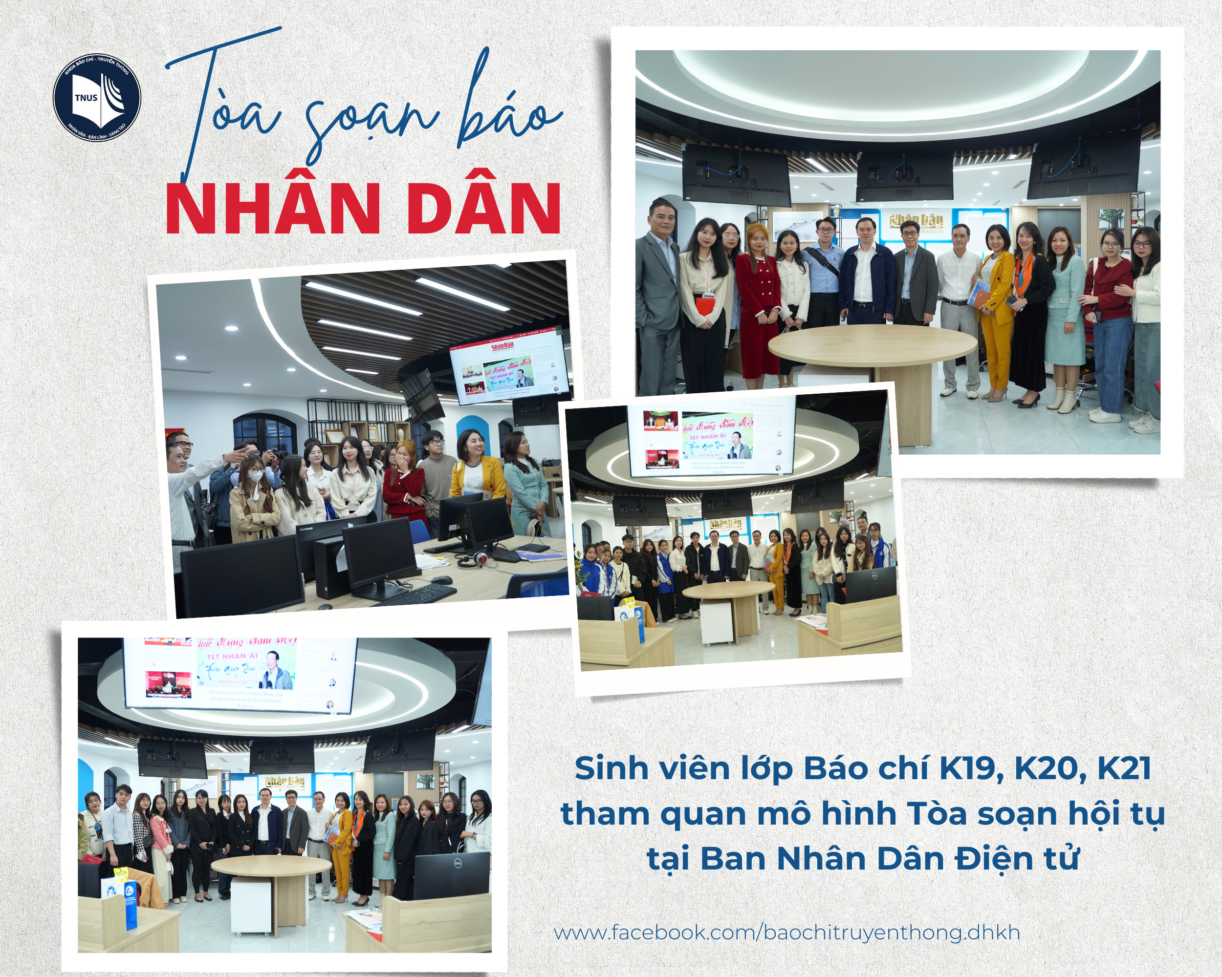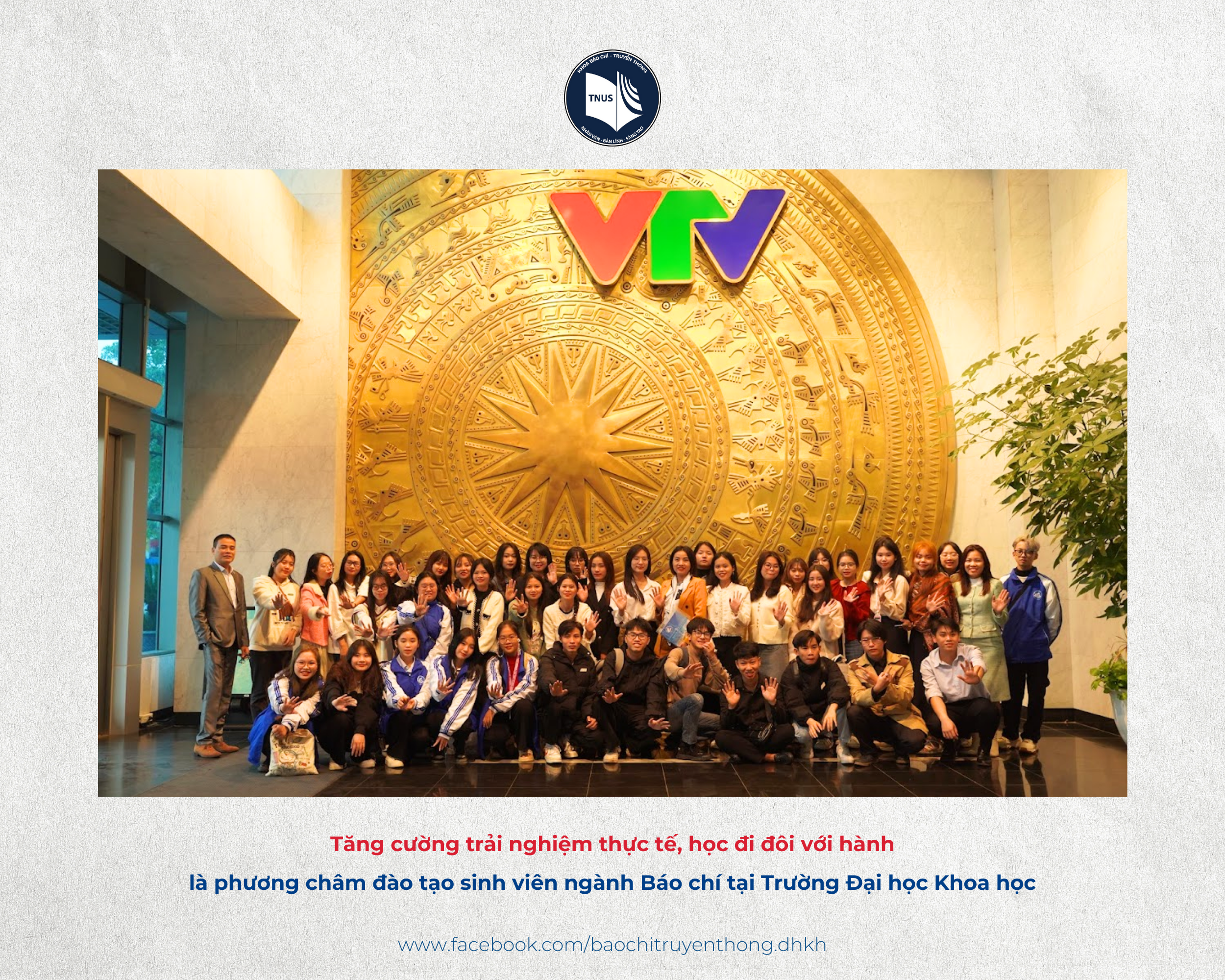 Với phương châm "học đi đôi với hành", sáng 17/1 vừa qua, gần 50 giảng viên, sinh viên Khoa Báo chí - Truyền thông, Trường Đại học Khoa học, Đại học Thái Nguyên đã có chuyến tham quan trải nghiệm tại Đài Truyền hình Việt Nam (VTV) và Toà soạn Báo Nhân Dân. Hành trình này không chỉ đem đến những trải nghiệm thực tế đầy thú vị mà còn thắp lên niềm đam mê và tình yêu của các bạn sinh viên với nghề Báo.