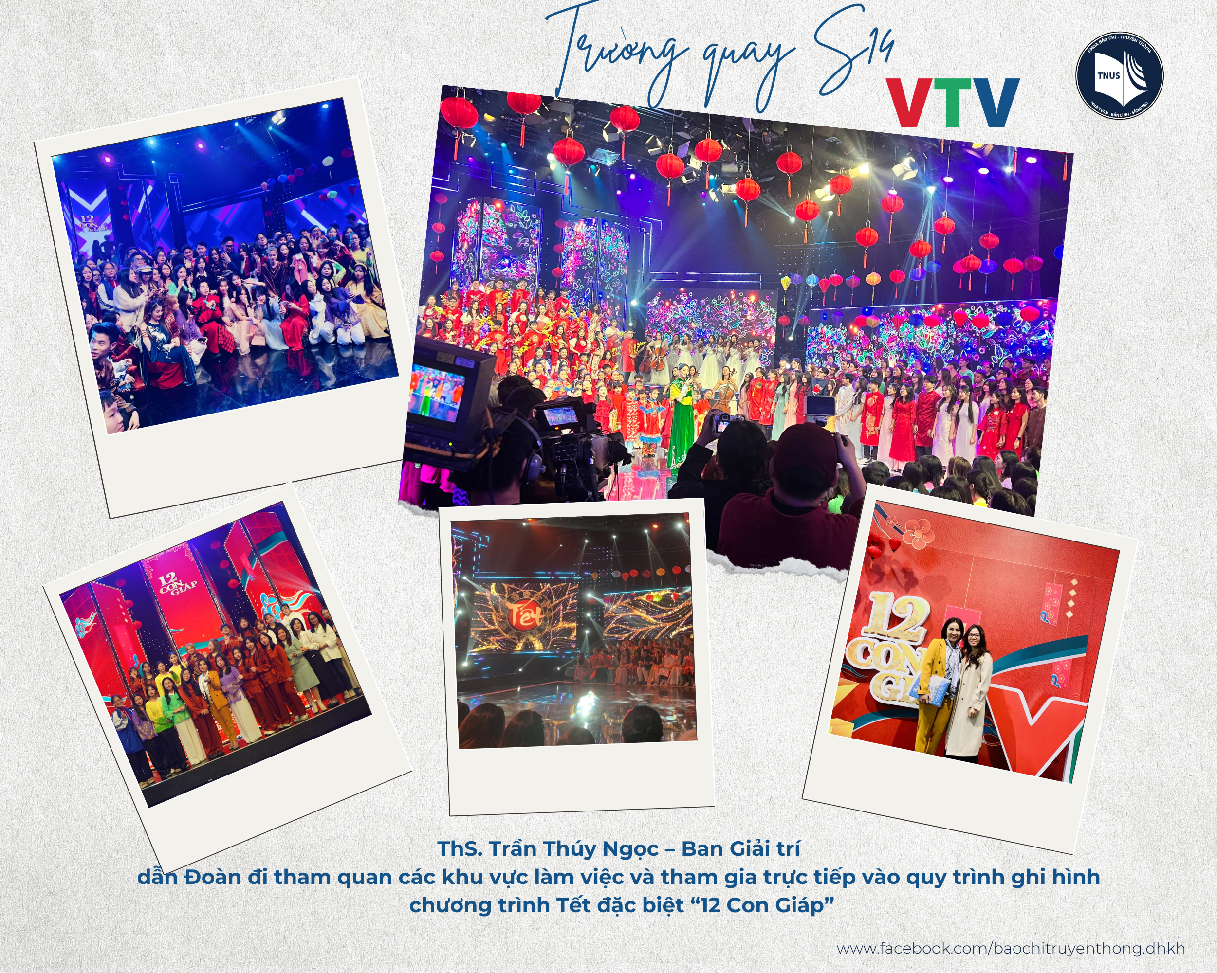 Tại Đài Truyền hình Việt Nam, Đoàn được ThS. Trần Thúy Ngọc – Ban Giải trí của Đài đón tiếp và đưa đi tham quan các khu vực làm việc trong tòa nhà của Đài Truyền hình Việt Nam như: Khu tư liệu trưng bày, trạm phát sóng, khu vực trường quay, khu dựng hình, khu làm việc của một số Ban trong Đài. Đặc biệt, giảng viên và sinh viên của Khoa đã có cơ hội trực tiếp trải nghiệm trong vai trò diễn viên và khán giả của chương trình ghi hình đặc biệt "12 con Giáp" (trường quay S14) sẽ phát sóng vào ngày mùng 3 Tết Nguyên Đán. Tại đây, các bạn sinh viên đã được chứng kiến trọn vẹn quy trình tiền kỳ ghi hình sản xuất chương trình truyền hình, từ đón tiếp và trao đổi với khách mời, sắp xếp, chuẩn bị thiết bị, đến cách thức tổ chức khán giả, diễn viên vào các phân cảnh quay, sự phối hợp của các bộ phận trong quá trình ghi hình... Tại đây, Đoàn còn được đạo diễn Ninh Quang Trường – Ban Giải trí chia sẻ chân tình, cởi mở về quá trình lao động của các ê kip phóng viên tại Đài Truyền hình Việt Nam.