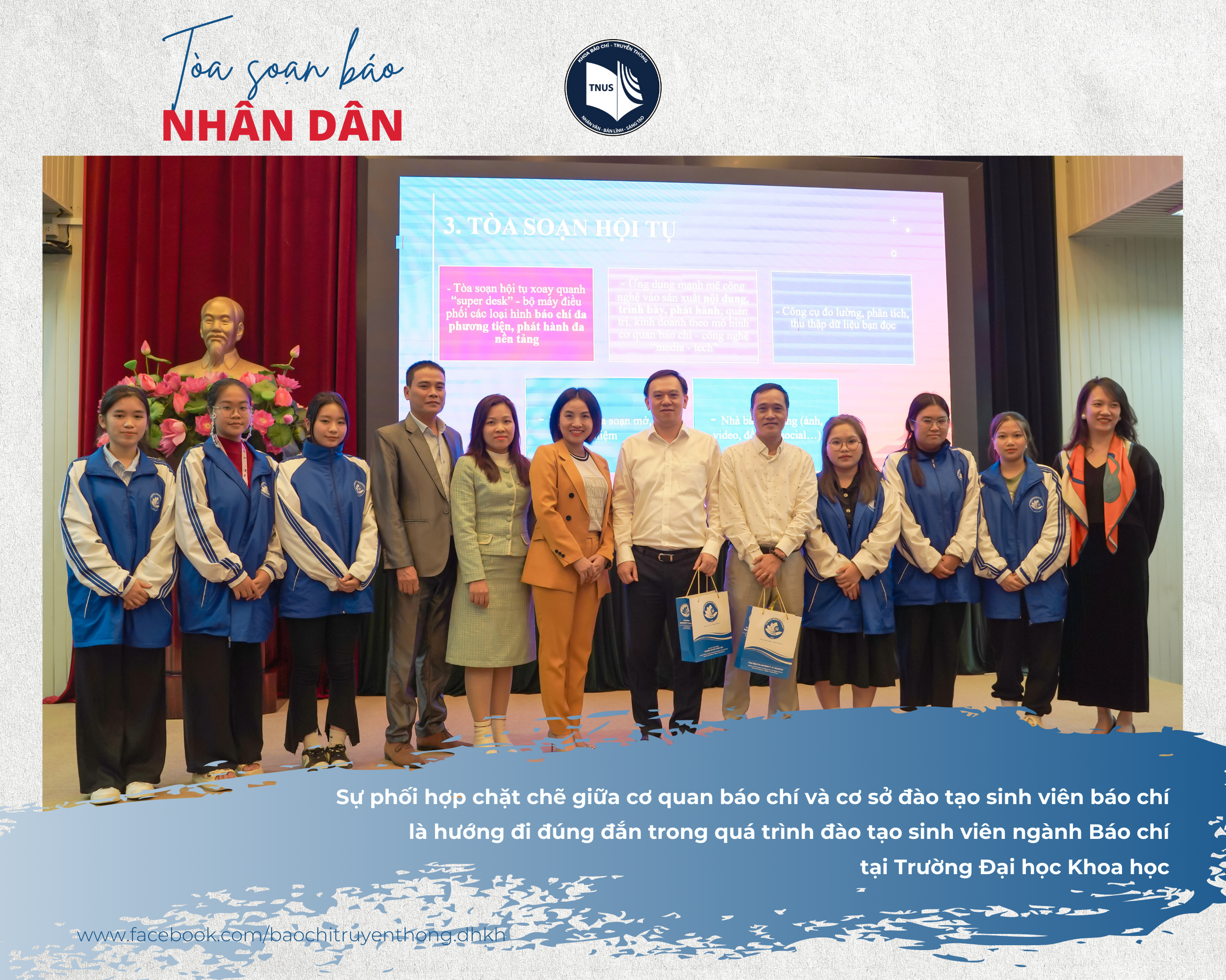 Có thể nói, chuyến trải nghiệm này không chỉ là minh chứng về việc phối hợp chặt chẽ giữa cơ quan báo chí và cơ sở đào tạo sinh viên báo chí, là sự khẳng định hướng đi đúng đắn trong việc đào tạo lý thuyết gắn với thực hành mà nó còn góp phần thắp sáng thêm ngọn lửa đam mê giúp các bạn sinh viên ngành Báo vững tin khi lựa chọn gửi gắm thanh xuân trong những năm tháng học tập tại Khoa Báo chí – Truyền thông, Trường Đại học Khoa học.
