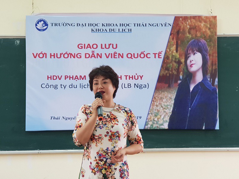 Tại buổi giao lưu, khách mời Phạm Thị Minh Thủy đã chia sẻ kiến thức, kinh nghiệm về nghiệp vụ hướng dẫn cũng như con đường rèn nghề và những cơ duyên trên hành trình trở thành một hướng dẫn viên du lịch quốc tế thành công.