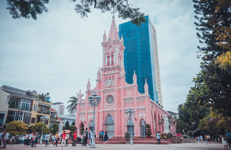 Giống như tất cả các nhà thờ khác, Nhà thờ lớn Đà Nẵng luôn hiện ra với dáng vẻ linh thiêng và thanh bình. Điểm nhấn đáng nhớ nhất về Nhà thờ Đà Nẵng là vẻ ngoài màu hồng khiến cho du khách nếu thoạt nhìn Nhà thờ giống như một viên kẹo khổng lồ với bảy ngọn tháp cao chót vót được dựng lên bằng một cây thánh giá. Năm vòm nhọn được xây dựng, thường chỉ có cửa phụ. Tôi đặc biệt thích cảm giác ngắm Nhà thờ vào những ngày trời trong xanh. Dưới bầu trời xanh, Nhà thờ thực sự nổi bật với những tháp nhọn và tone sắc hồng. Chụp ảnh Nhà thờ dưới phông nền này bạn sẽ thấy Nhà thờ trở nên hấp dẫn hơn rất nhiều.