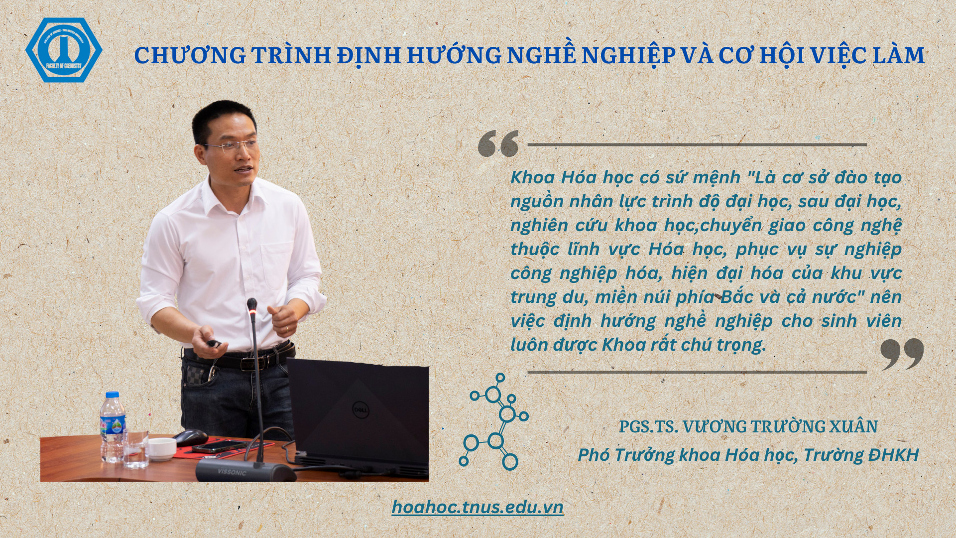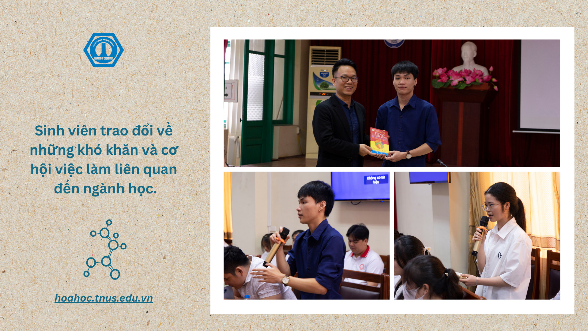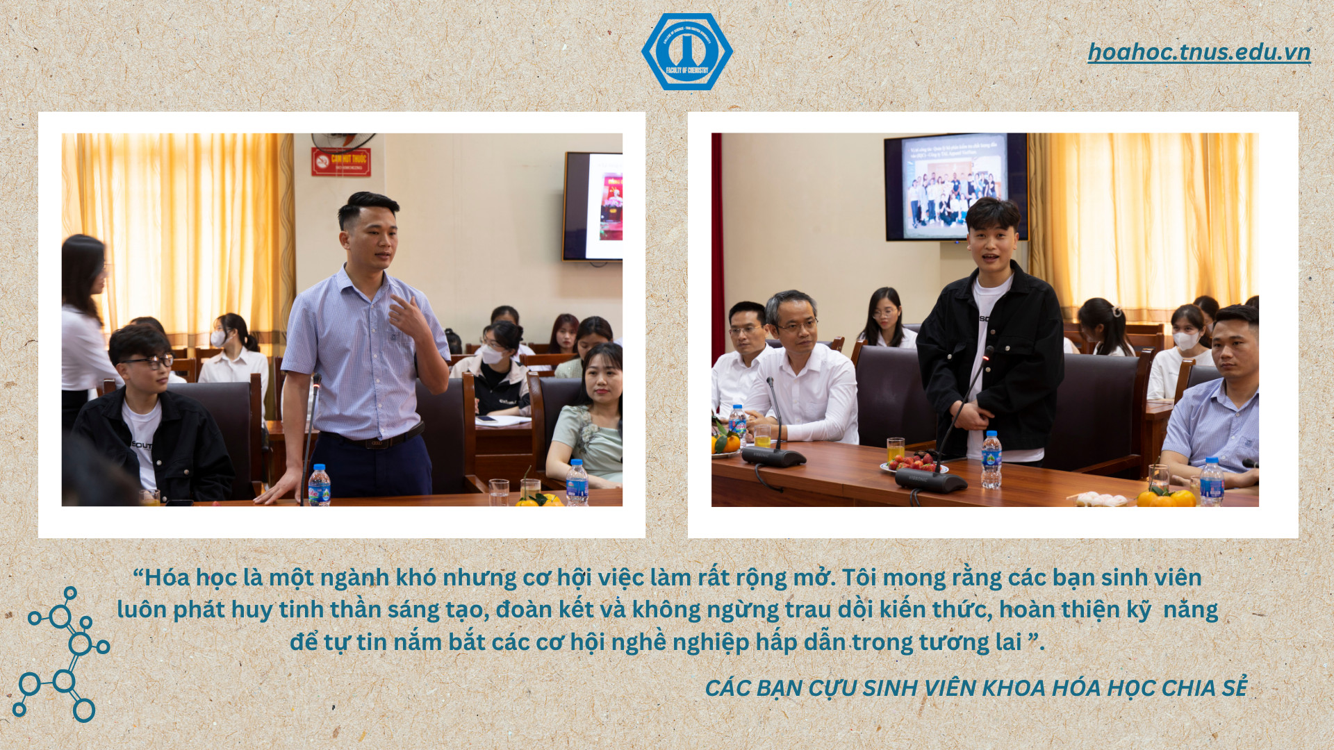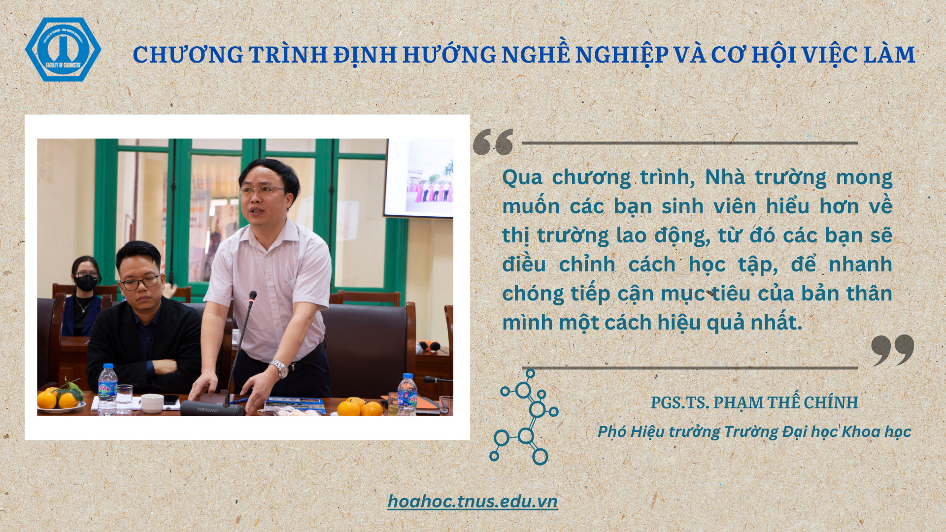 “Đây là chương trình do khoa Hóa học tổ chức thường niên và luôn nhận được sự quan tâm của đông đảo của các bạn sinh viên trong và ngoài Khoa. Hy vọng sau khi tham dự chương trình này, các bạn sinh viên sẽ thêm vững tin vào quyết định lựa chọn ngành học để từ đó xác định mục tiêu, phương pháp, kế hoạch học tập phù hợp để biến ước mơ thành hiện thực.” - TS Bùi Minh Quý – Trưởng khoa Hóa học khẳng định.