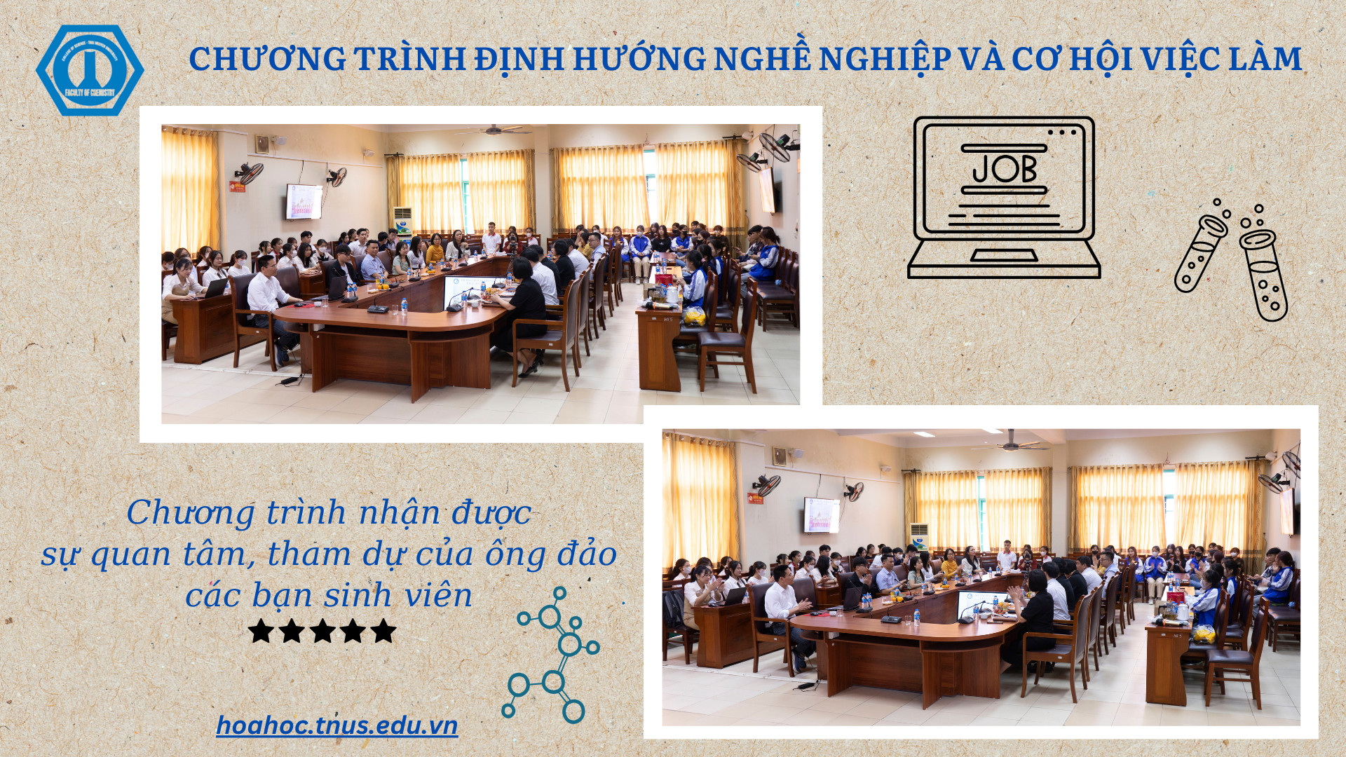Với mục tiêu gắn kết giữa cơ sở đào tạo và nhà tuyển dụng, giúp sinh viên có định hướng đúng đắn trong quá trình học tập và tìm kiếm cơ hội việc làm phù hợp sau khi tốt nghiệp, sáng ngày 29/3/2024, Khoa Hóa học, Trường Đại học Khoa học đã tổ chức Chương trình “Định hướng nghề nghiệp và cơ hội việc làm cho sinh viên” dành cho sinh viên trong toàn Khoa.