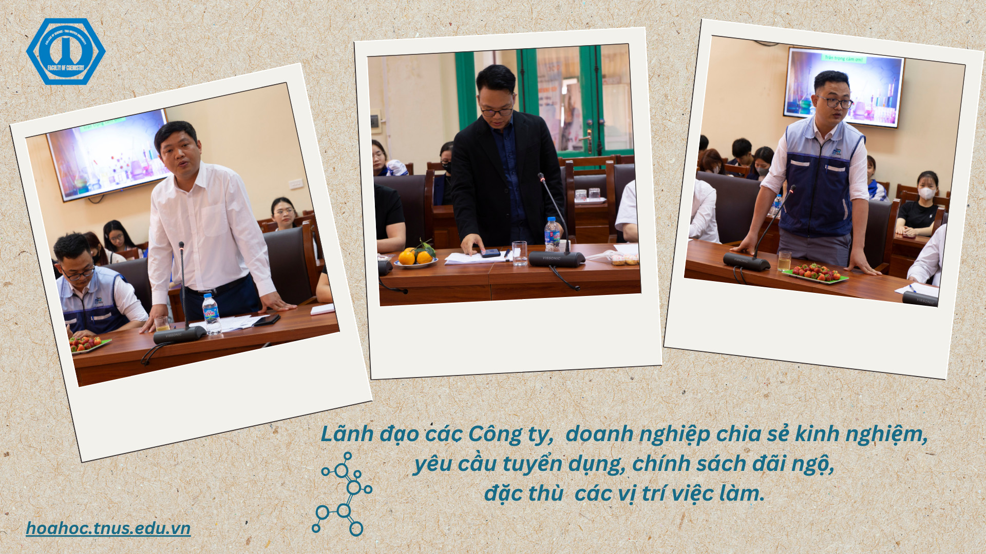 Tại chương trình “Định hướng nghề nghiệp và cơ hội việc làm cho sinh viên”, các bạn sinh viên đã được các chuyên gia, các doanh nghiệp chia sẻ các thông tin về yêu cầu tuyển dụng, chính sách đãi ngộ, đặc thù các vị trí việc làm liên quan đến ngành công nghệ kỹ thuật hóa học và hóa dược. Những tư vấn, định hướng của nhà tuyển dụng giúp các bạn sinh viên có cái nhìn đúng và thực tế hơn với ngành nghề mình đã chọn. Thông qua một loạt hoạt động ý nghĩa này, các bạn sinh viên không chỉ được biết thêm nhiều thông tin nghề nghiệp hữu ích, được giải đáp khó khăn, vướng mắc trong việc định hướng tương lai mà còn được truyền cảm hứng từ những tấm gương cựu sinh viên tiêu biểu đã có việc làm tốt sau khi ra trường, được sự khích lệ động viên của các nhà tuyển dụng và thầy cô trong Khoa.
