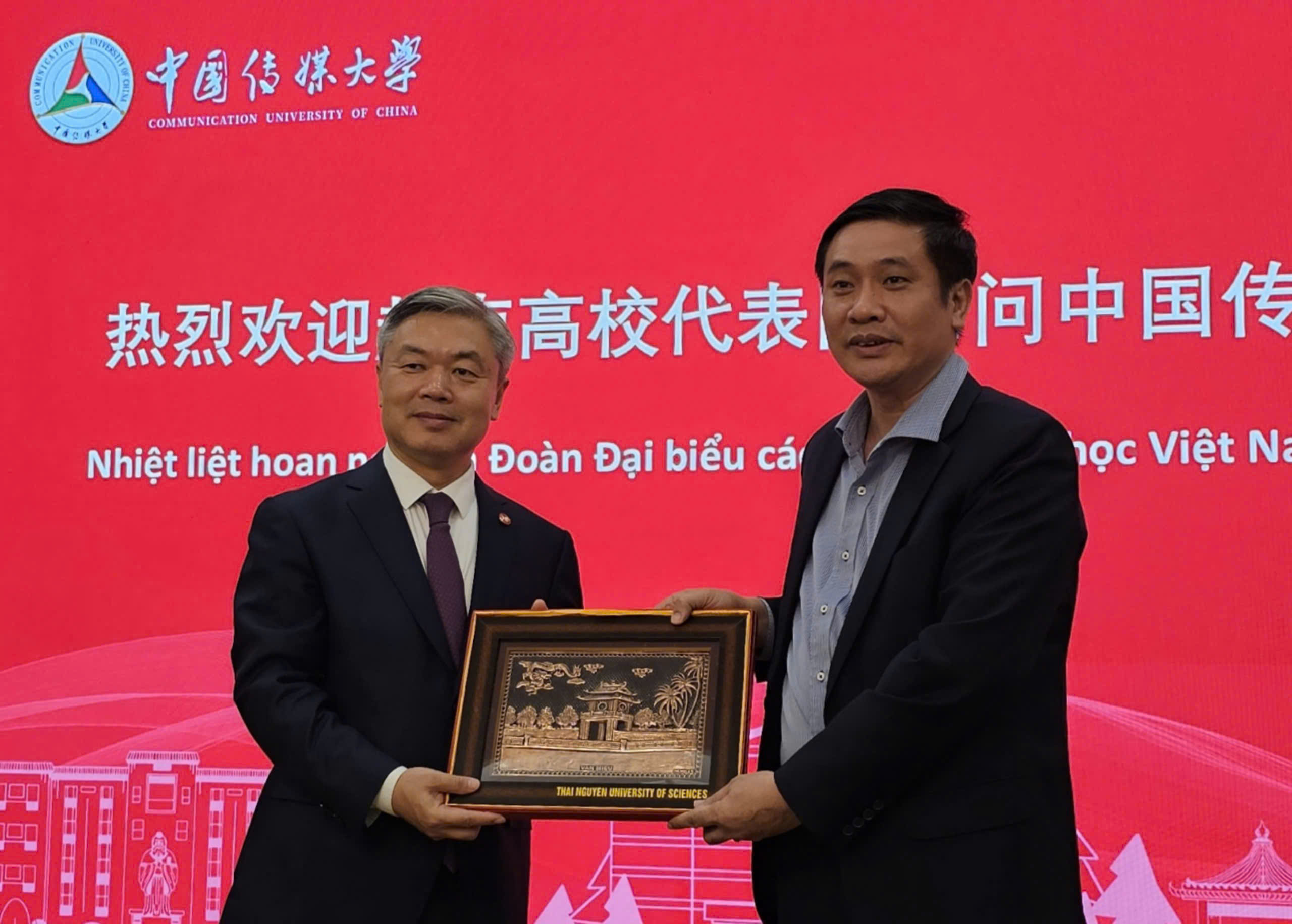 PGS.TS. Nguyễn Văn Đăng - Hiệu trưởng Trường ĐHKH, tặng quà lưu niệm của Nhà trường cho GS.TS. Liêu Tường Trung, Bí thư Đảng ủy Đại học Truyền thông Trung Quốc