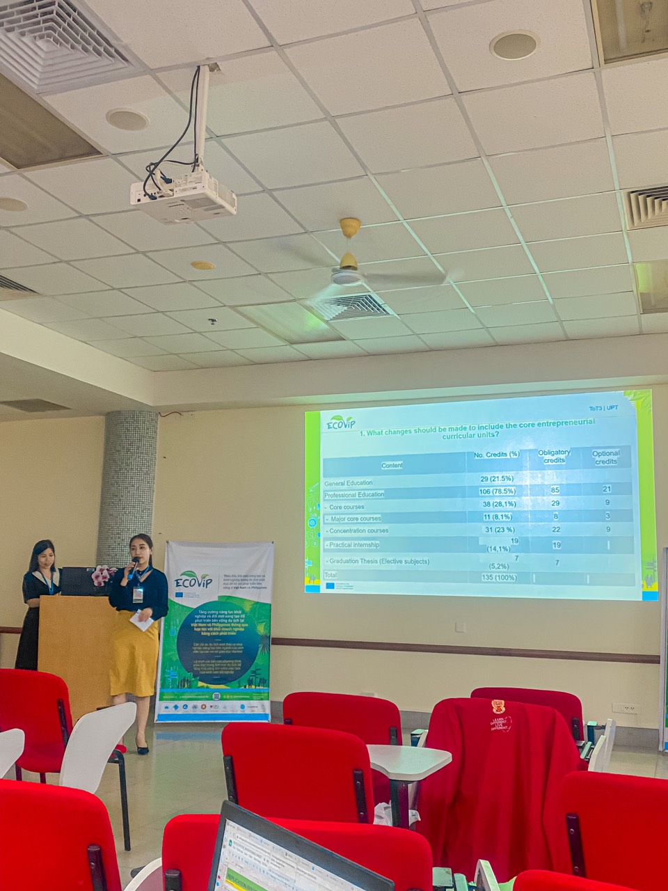 Cũng trong khoá tập huấn, các thành viên điều phối dự án đã thực hiện việc rà soát tiến độ thực hiện các gói công việc theo từng giai đoạn. Trong đó nhóm thành viên dự án Ecovip của trường Đại học khoa học cũng đã trình bày về tiến độ gói công việc số 8 (WP 8) – thiết lập và vận hành không gian hỗ trợ khởi nghiệp du lịch sinh thái Ecotourism Hub - với vai trò phụ trách chính và tham gia thúc đẩy các hoạt động nhằm đảm bảo tiến độ thực hiện đề ra của dự án gia (Ảnh 8,9).
