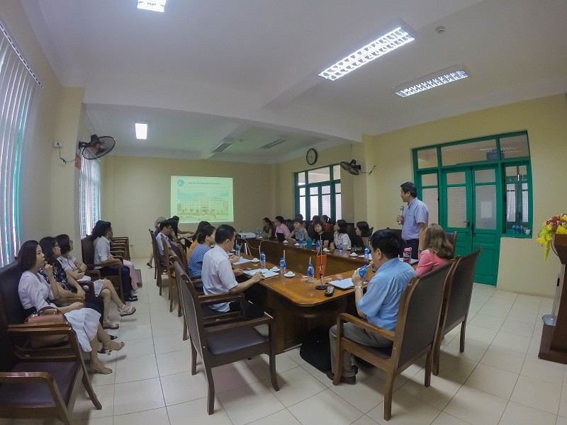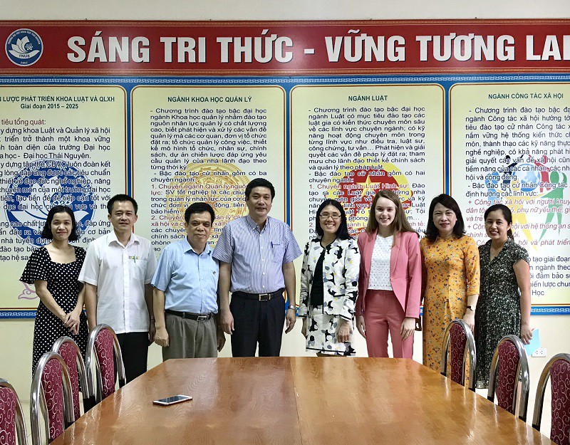 Đón tiếp GS. Nguyễn Xuân Thảo và PGS.TS. Nguyễn Tất Viễn, về phía Nhà trường có: PGS.TS Nguyễn Văn Đăng – Hiệu trưởng Nhà trường; TS. Hoàng Lâm – Trưởng phòng Hợp tác quốc tế; TS. Lê Thị Ngân – Trưởng Khoa Luật và Quản lý xã hội cùng các giảng viên trong Khoa.