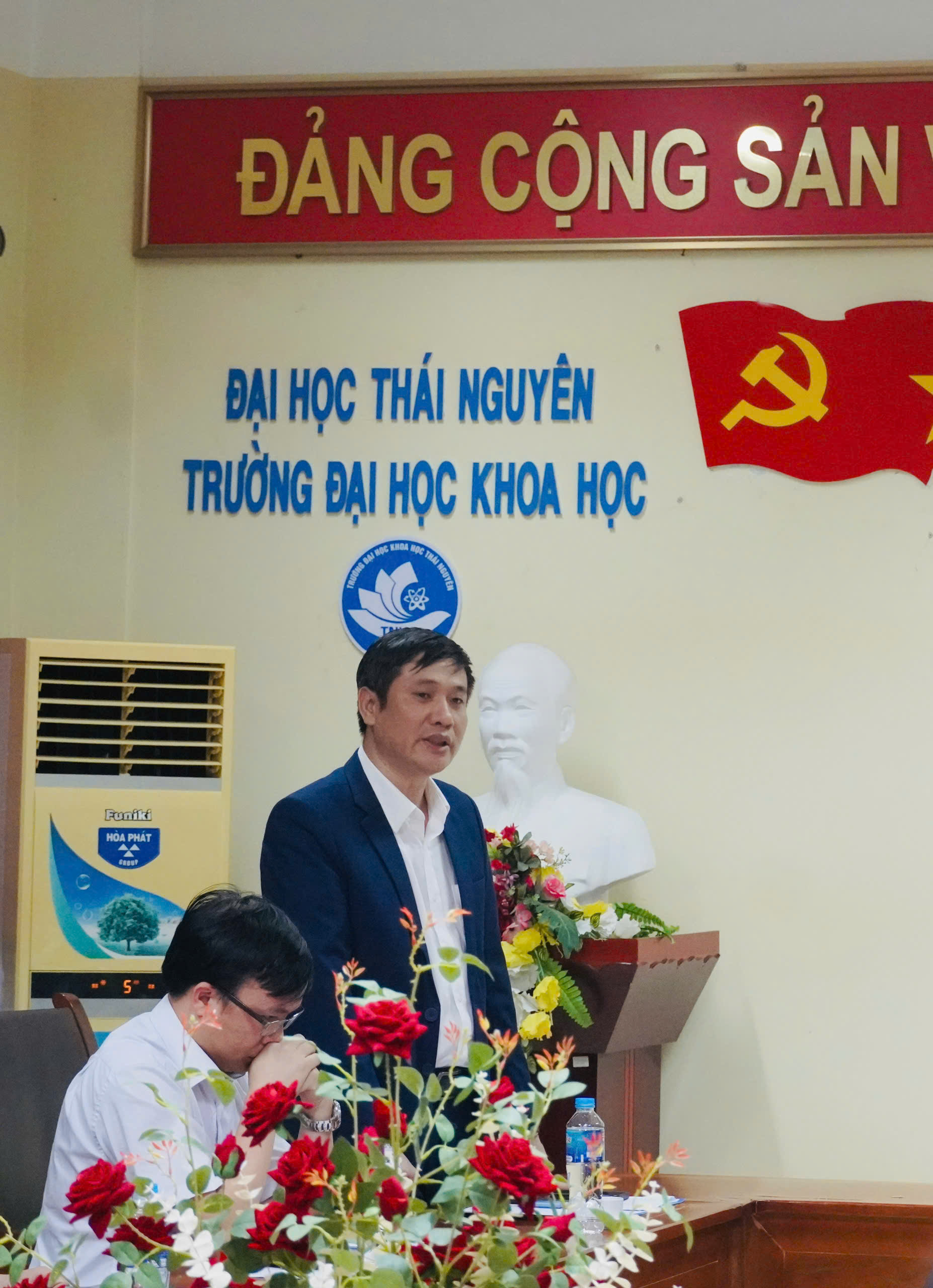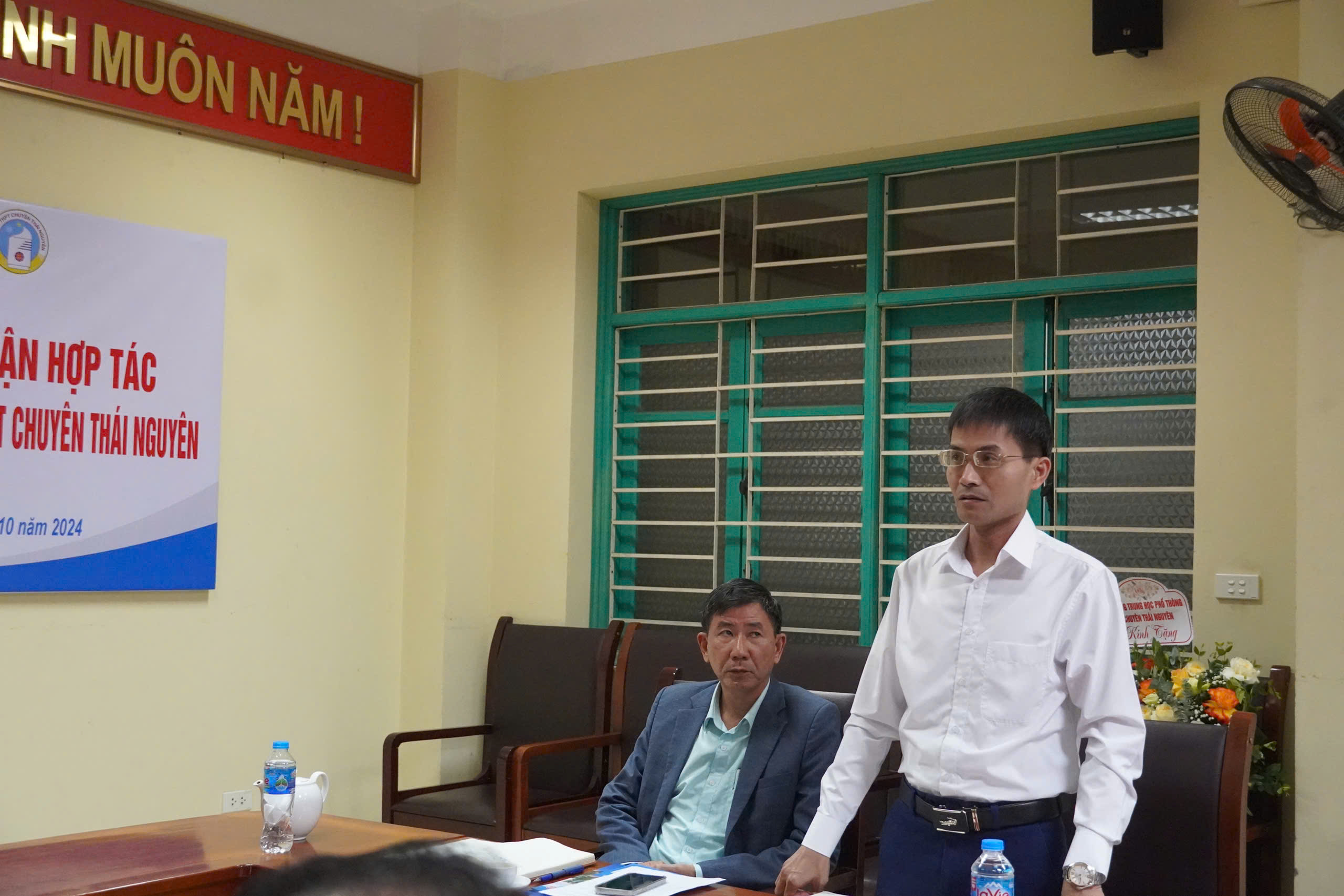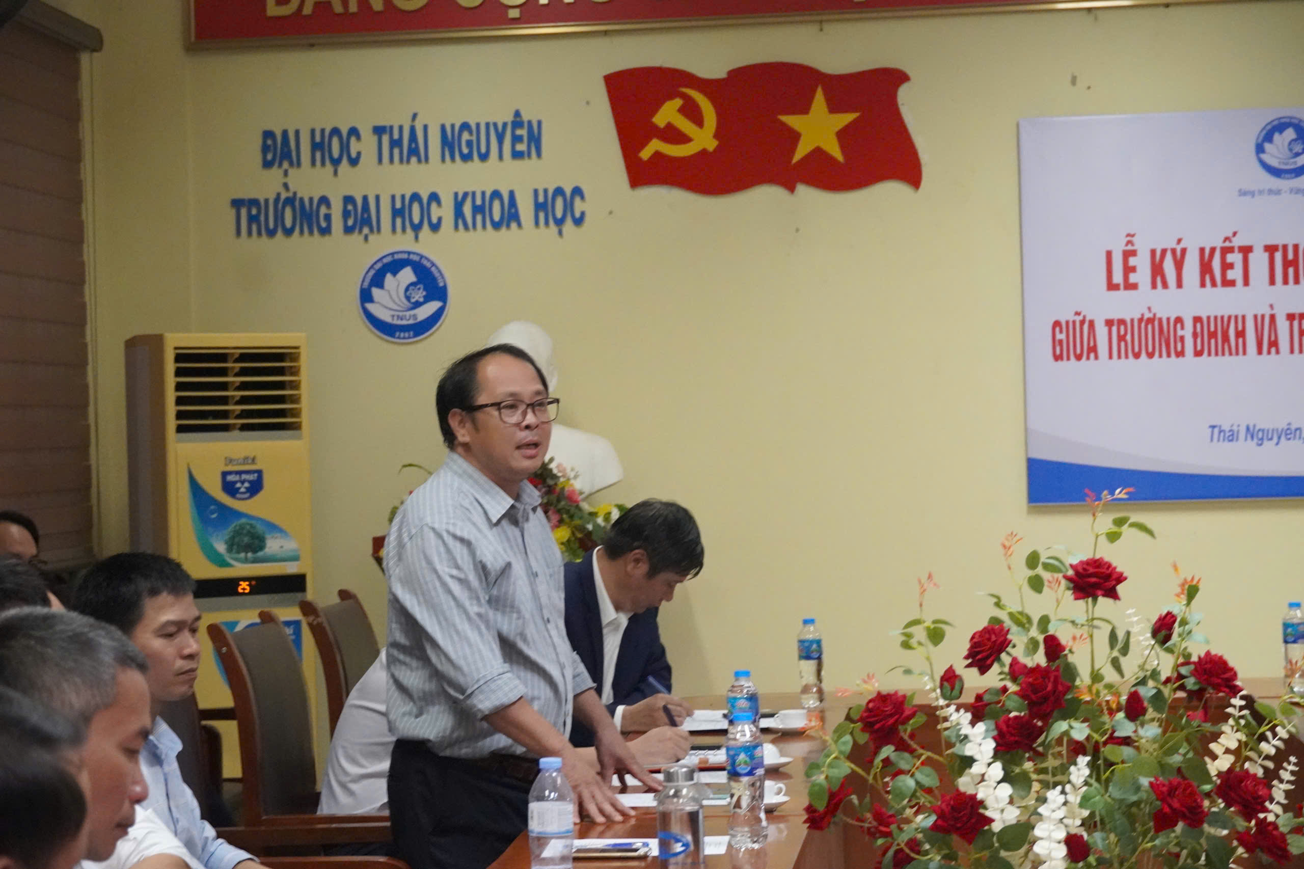 Thay mặt đoàn công tác của Trường THPT Chuyên Thái Nguyên, ThS. NGƯT. Trần Văn Hưng - Bí thư Đảng uỷ - Hiệu trưởng Nhà trường, đã cảm ơn những thịnh tình mà tập thể lãnh đạo Trường ĐHKH đã dành cho Trường THPT Chuyên Thái Nguyên. Thầy đã có những giới thiệu chung về Trường và đặc biệt nhấn mạnh vào chất lượng đào tạo và những thành tích NCKH mà thầy và trò Nhà trường đã đạt được trong những năm qua tại các cuộc thi về khoa học kỹ thuật, thi học sinh giỏi các cấp. Thầy nhận định rằng, với những tiềm năng và thế mạnh của Trường ĐHKH và Trường THPT Chuyên Thái Nguyên, sự kiện ký kết hợp tác lần này sẽ là tiền đề tốt cho sự phát triển toàn diện của cả hai đơn vị, đặc biệt là trong hoạt động đào tạo và NCKH.