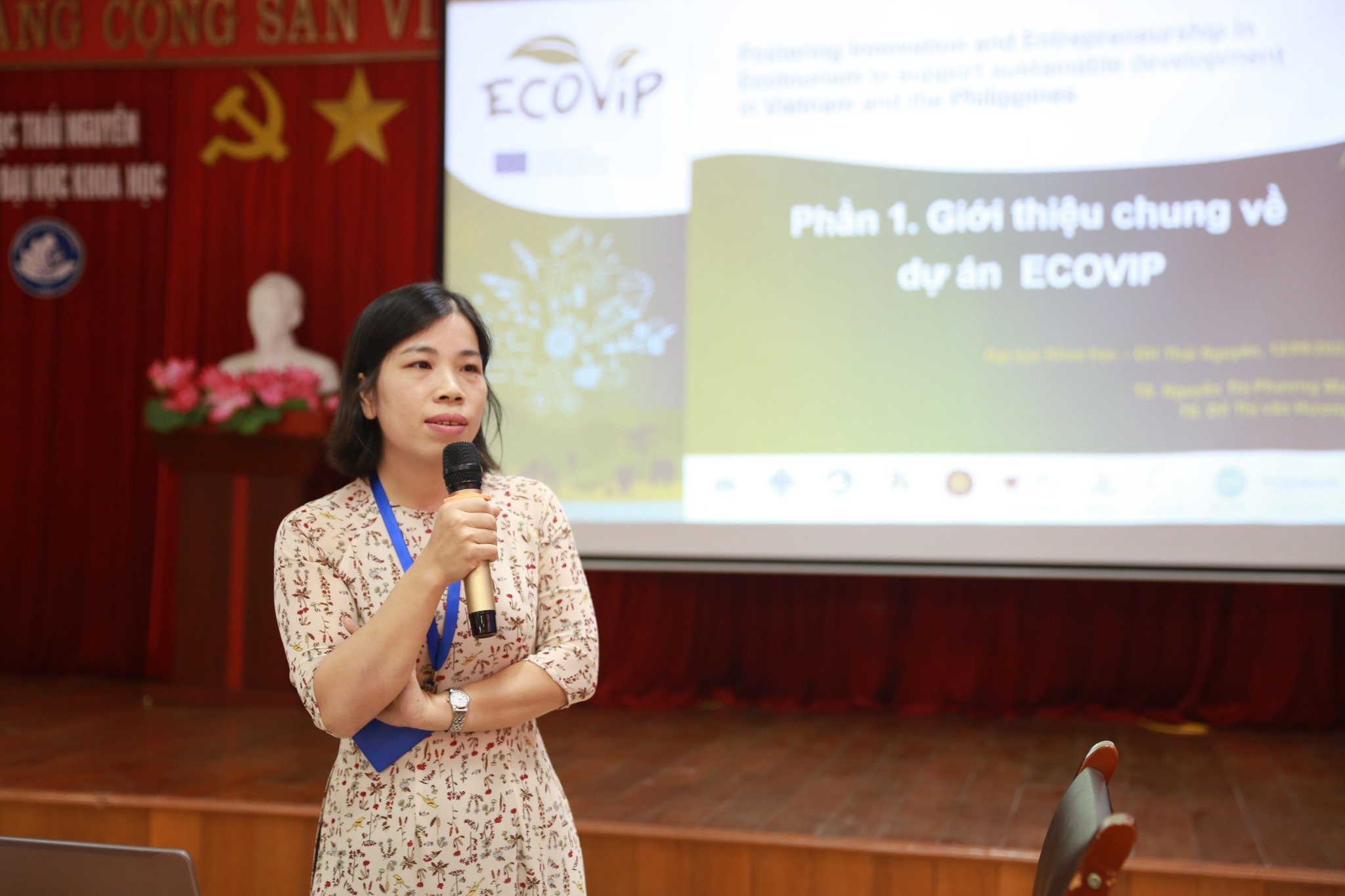 Nội dung 3: “ECOVIP và sinh viên” do TS Đỗ Thị Vân Hương trình bày: Từ việc thực thi dự án ECOViP, trường Đại học Khoa học và sinh viên được hưởng nhiều lợi ích. Trước tiên, Trường sẽ hình thành 01 Trung tâm du lịch sinh thái (Ecotourism Hub) với đầy đủ tư liệu, trang thiết bị nhằm thúc đẩy hoạt động khởi nghiệp du lịch sinh thái và các mục tiêu phát triển bền vững (SDGs), hỗ trợ phát triển các dự án kinh doanh đổi mới và đa ngành. Thứ hai, các khoá tập huấn về khởi nghiệp và Dự án khởi nghiệp của sinh viên nhằm thúc đẩy, hỗ trợ nhận thức khời nghiệp của sinh viên. Trong đó, các mentor và Doanh nghiệp được lựa chọn sẽ hỗ trợ SV hoàn thành tốt ý tưởng, thiết kế, xây dựng kế hoạch kinh doanh cơ bản và cách thức marketing, quảng bá kế hoạch. Thứ ba, sinh viên được tham gia chương trình ECOViP Boot Camp - chương trình tập huấn mùa hè chuyên sâu kéo dài 1 tuần tại Philippines. Ngoài ra, thông qua dự án, sinh viên tự tin, được học hỏi, truyền cảm hứng từ kinh nghiệm của các doanh nhân trong lĩnh vực DLST; nâng cao nhận thức về khởi nghiệp và DLST; nâng cao nhận thức về các cơ hội và tiềm năng phát triển DLST; tăng cường mối quan hệ giữa cơ sở giáo dục và thị trường lao động...