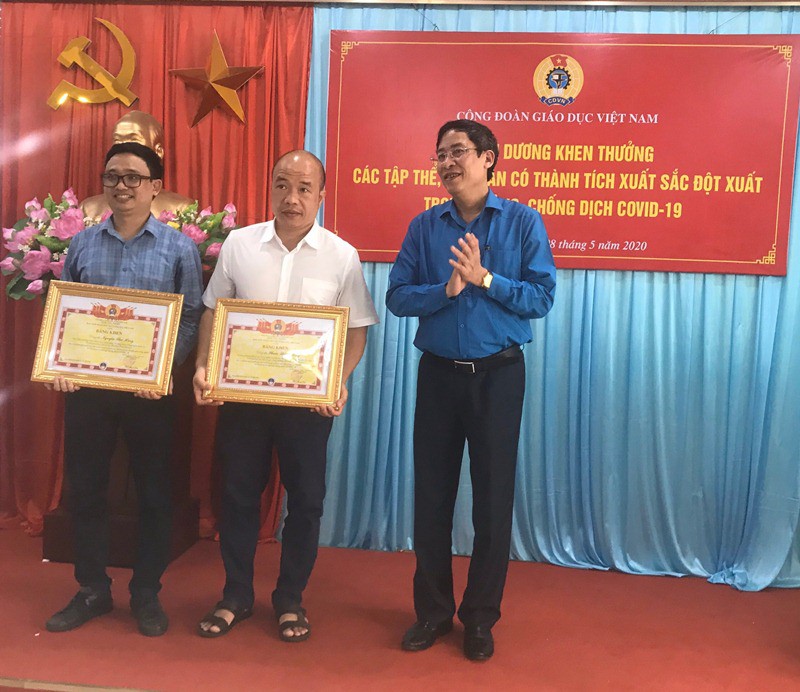 TS. Nguyễn Phú Hùng (ngoài cùng bên trái) nhận bằng khen của Công đoàn Giáo dục Việt Nam.