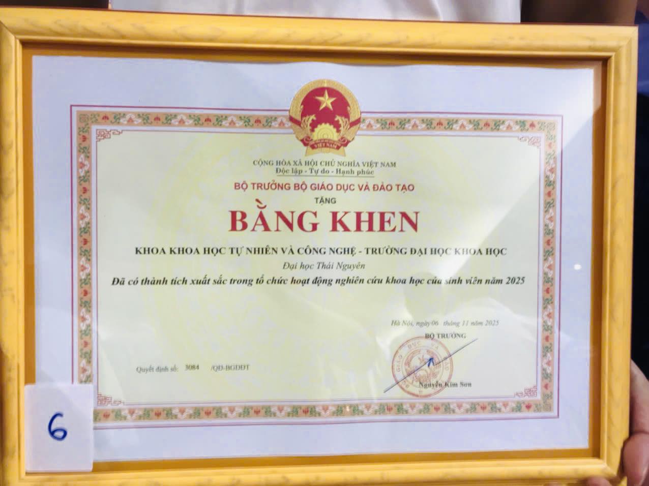 Các công trình này không chỉ cho thấy năng lực nghiên cứu vững vàng của sinh viên, mà còn đóng góp thiết thực cho lĩnh vực công nghệ xử lý môi trường, hướng tới mục tiêu phát triển bền vững và bảo vệ tài nguyên thiên nhiên. Với những thành tích xuất sắc đó, Khoa Khoa học Tự nhiên và Công nghệ, Trường Đại học Khoa học, là 1 trong 10 đơn vị trong toàn quốc được Bộ trưởng Bộ GD&ĐT trao tặng Bằng khen vì có thành tích xuất sắc trong hoạt động Nghiên cứu khoa học của sinh viên năm 2025.