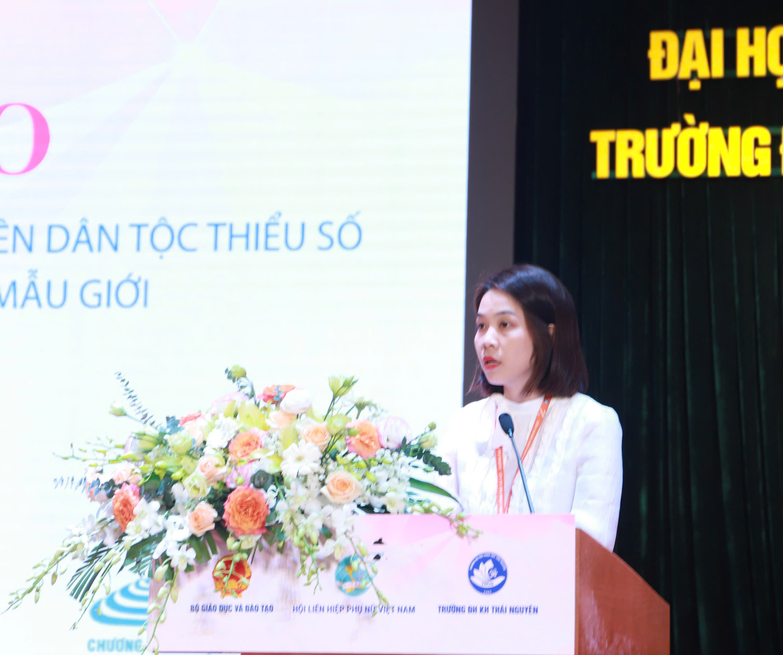 Đại diện cho Nhà trường, PGS.TS. Phạm Thế Chính – Phó Hiệu trưởng Nhà trường tham gia chủ trì Hội thảo, TS. Tạ Thị Thảo – Phó Trưởng khoa Khoa KHXH&NV trình bày tham luận về “Giải pháp phát huy vai trò của sinh viên dân tộc thiểu số trong thực hiện bình đẳng giới tại trường đại học” dựa trên kinh nghiệm thực tiễn trong hoạt động thúc đẩy bình đẳng giới tại Nhà trường.