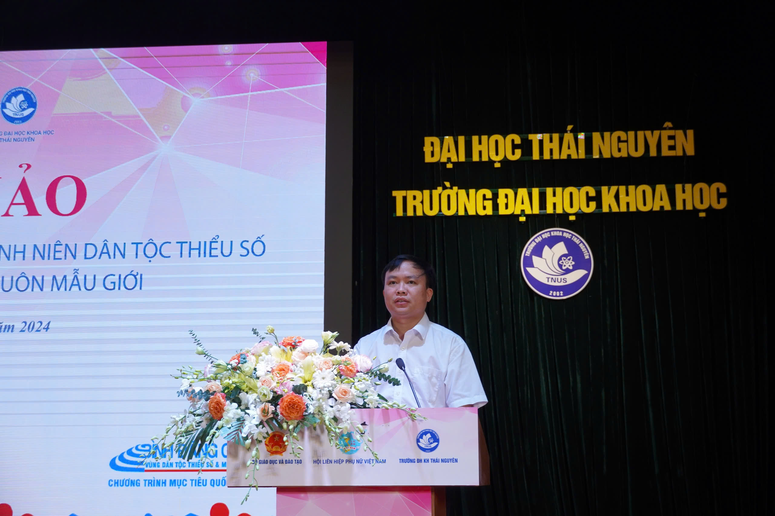 PGS.TS. Phạm Thế Chính – Phó Hiệu trưởng Trường Đại học Khoa học phát biểu tại Hội thảo: “Hội thảo lần này là một bước khởi đầu quan trọng trong việc tiếp tục phát huy vai trò tiên phong của thanh niên dân tộc thiểu số trong việc thay đổi định kiến và khuôn mẫu giới. Tuy nhiên, hành trình này vẫn còn dài và đòi hỏi sự đồng lòng, chung tay của tất cả các cơ quan, tổ chức cũng như sự quyết tâm của bản thân các bạn trẻ. Trong thời gian tới, chúng tôi mong rằng các hoạt động, mô hình mà các bạn thanh niên đã chia sẻ sẽ được nhân rộng và áp dụng tại nhiều địa phương trên cả nước. Đồng thời, chúng tôi cũng kỳ vọng rằng các cấp chính quyền, các tổ chức xã hội sẽ tiếp tục tạo điều kiện thuận lợi để thanh niên dân tộc thiểu số có thể tham gia tích cực hơn vào các hoạt động phát triển kinh tế, xã hội và văn hóa tại cộng đồng, đặc biệt là trong việc xóa bỏ những định kiến giới và khuôn mẫu giới.”