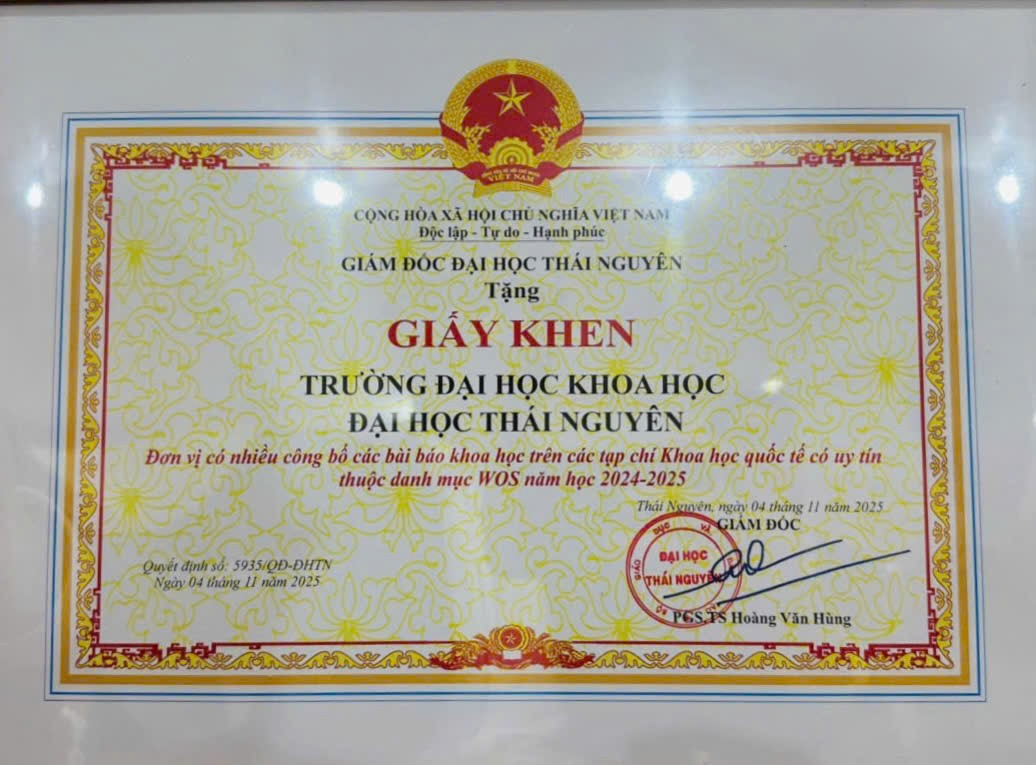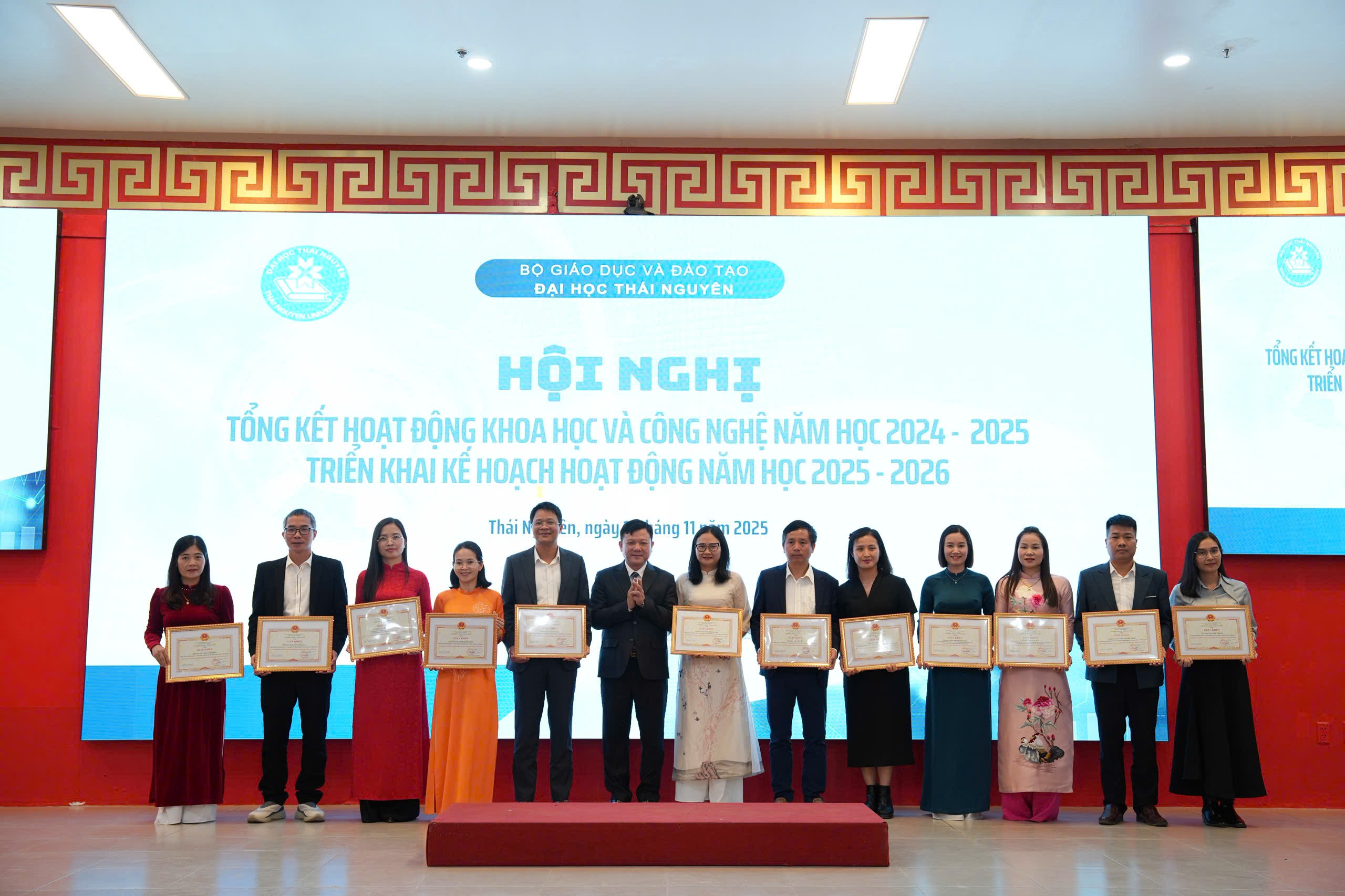 Để nghi nhận những thành tích, đóng góp của các tập thể, cá nhân có thành tích xuất sắc trong hoạt động KHCN của Đại học Thái Nguyên năm học 2024 - 2025, Giám đốc Đại học Thái Nguyên quyết định tặng giấy khen cho 03 tập thể và 43 cá nhân có đóng góp nổi bật.