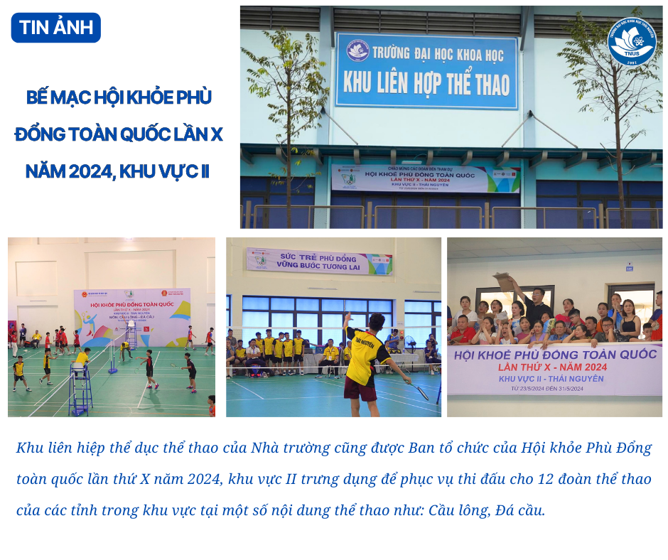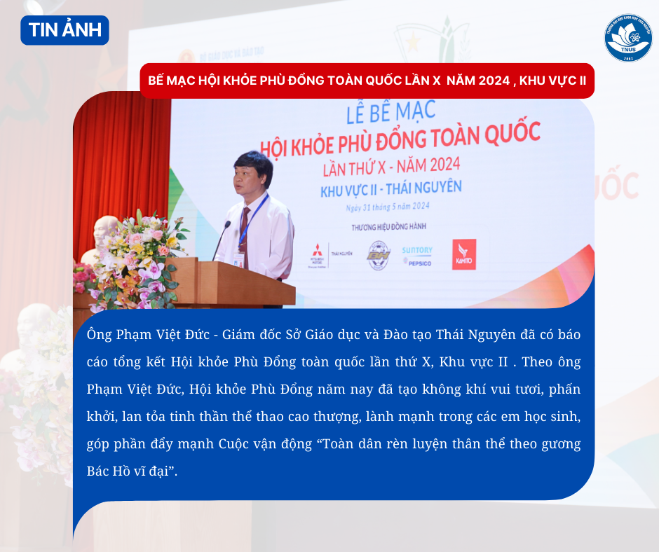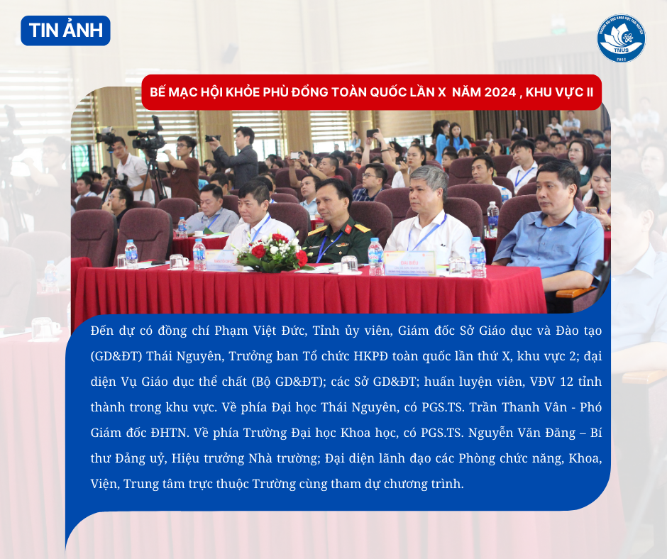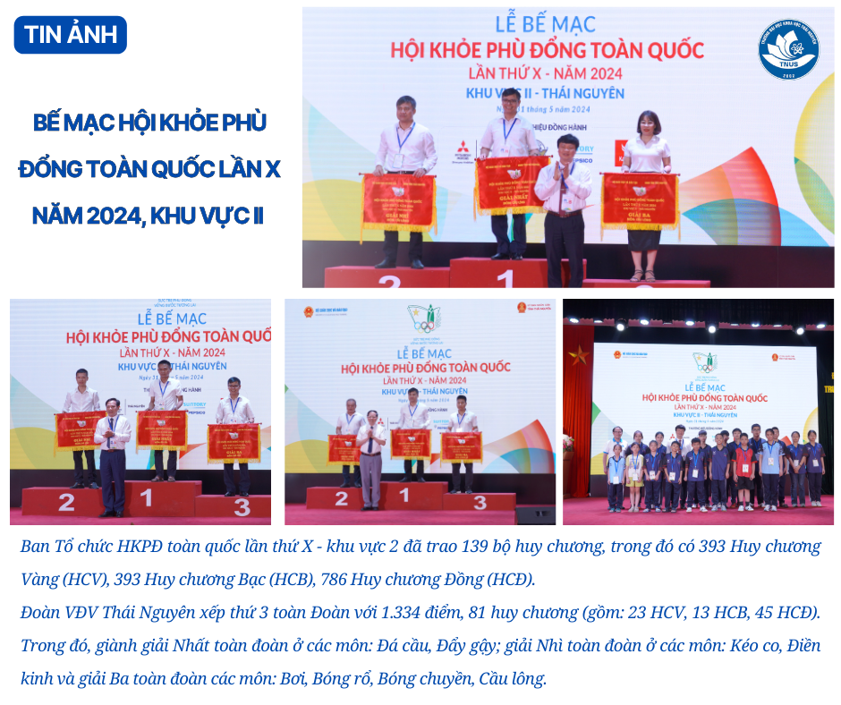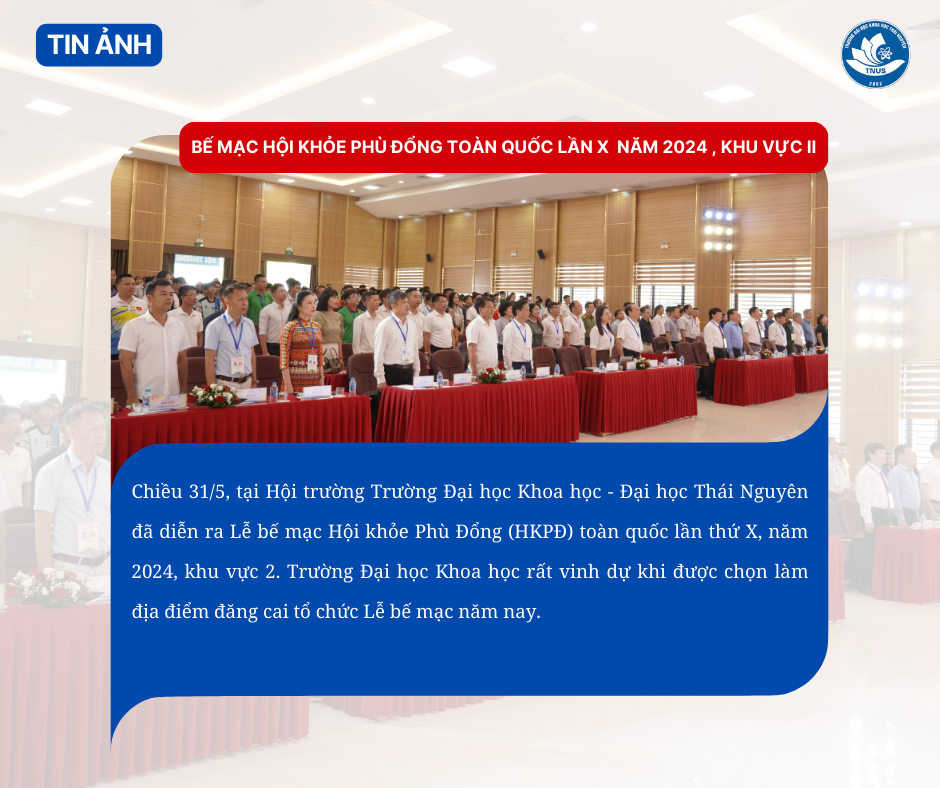 Chiều 31/5, tại Hội trường Trường Đại học Khoa học - Đại học Thái Nguyên đã diễn ra Lễ bế mạc Hội khỏe Phù Đổng (HKPĐ) toàn quốc lần thứ X, năm 2024, khu vực 2. Trường Đại học Khoa học rất vinh dự khi được chọn làm địa điểm đăng cai tổ chức Lễ bế mạc năm nay.