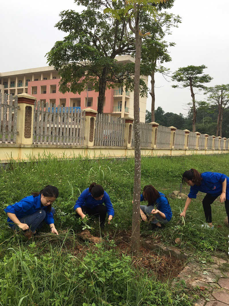 Các em sinh viên thực hiện dọn cỏ trong khuôn viên Nhà trường