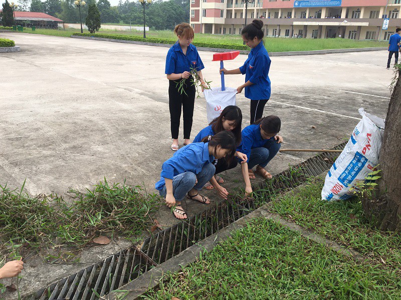 Các em sinh viên dọn rác trong Trường
