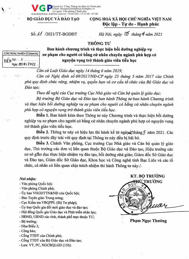 Link tham khảo Thông tư 11: Thông tư 11/2021/TT-BGDĐT Chương trình bồi dưỡng nghiệp vụ sư phạm giáo viên tiểu học (luatvietnam.vn)