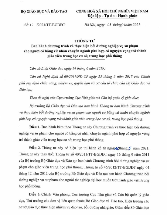 Link tham khảo Thông tư 12: Thông tư 12/2021/TT-BGDĐT Chương trình bồi dưỡng nghiệp vụ sư phạm THCS, THPT (luatvietnam.vn)