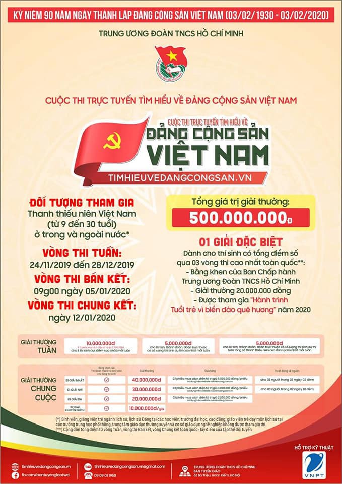 Hướng tới kỷ niệm 90 năm Ngày thành lập Đảng Cộng Sản Việt Nam (03/02/1930 – 03/02/2020), Trung ương Đoàn TNCS Hồ Chí Minh đã phát động Cuộc thi trực tuyến tìm hiểu về Đảng Cộng sản Việt Nam trên phạm vi cả nước. Cuộc thi diễn ra với chủ đề “Tuổi trẻ Việt Nam sắt son niềm tin với Đảng”.