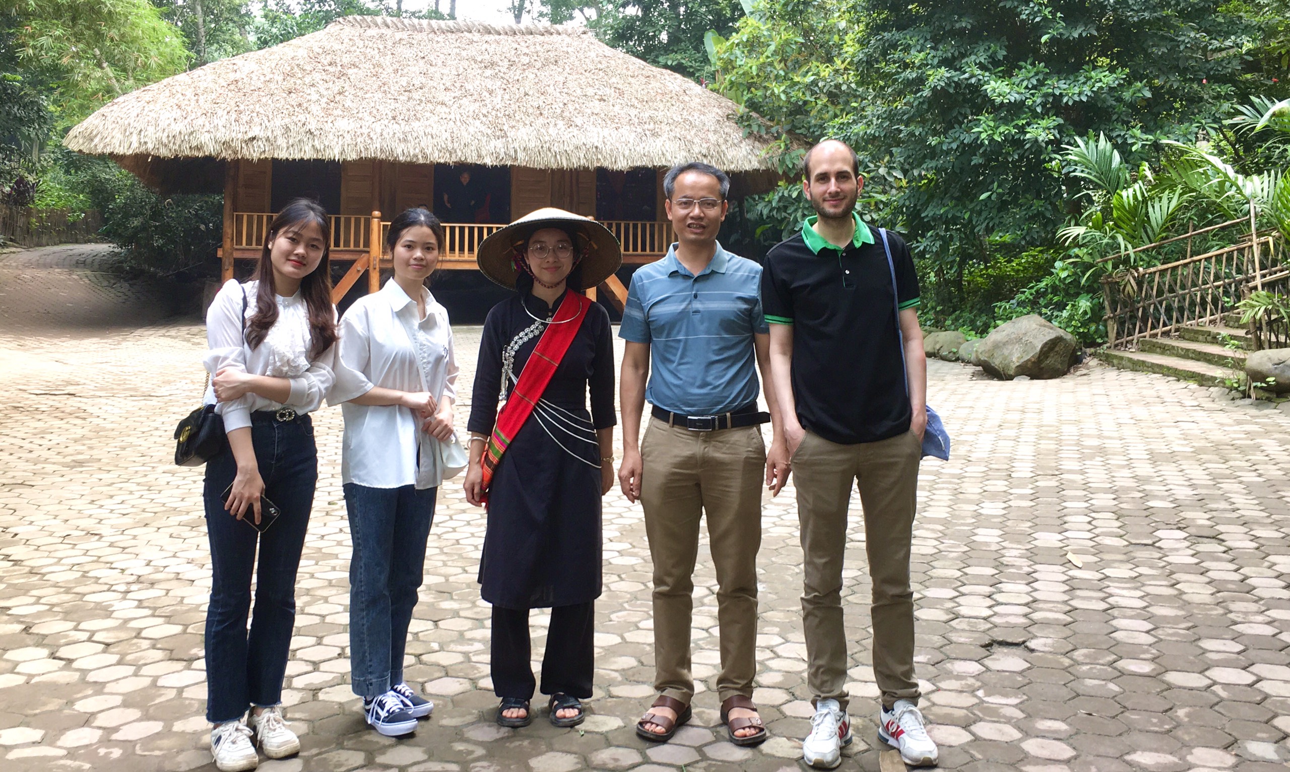 Giảng viên Adrián de la Fuente Ballesteros cùng với các em sinh viên khoa Hóa học thăm quan Khu bảo tồn Làng nhà sàn Dân tộc Sinh thái Thái Hải