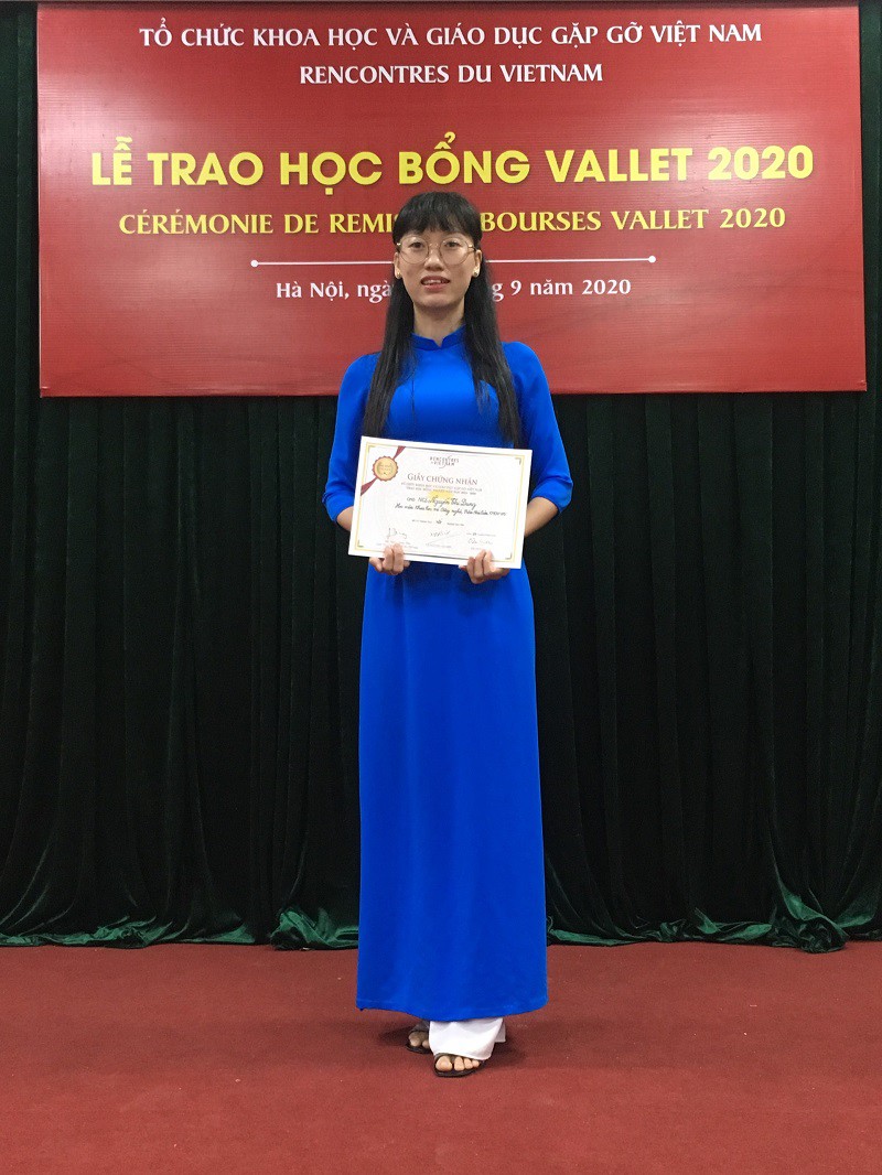 Hai cán bộ, giảng viên xuất sắc được nhận học bổng Vallet lần này là ThS.Nguyễn Thị Ngọc Linh – giảng viên Khoa Hóa học, ThS. Nguyễn Thị Dung – giảng viên Khoa Vật lý & Công nghệ. Sau 4 năm học tập và nghiên cứu tại Viện Hàn lâm Khoa học và Công nghệ Việt Nam, hai NCS đã có những thành tích đáng khích lệ, xứng đáng được nhận học bổng Vallet. Dưới sự hướng dẫn của PGS.TS. Ngô Quang Đại (Tập đoàn Hóa chất Việt Nam) và TS. Lê Trọng Lư, NCS Ngọc Linh đã đạt được một số thành tích với 24 bài báo, trong đó có 4 bài báo ISI. Còn với NCS Nguyễn Thị Dung, dưới sự hướng dẫn PGS.TS. Trần Đăng Thành (Viện Khoa học Vật liệu) và PSG.TS. Nguyễn Văn Đăng (Trường Đại học Khoa học – ĐHTN) đã có 14 bài báo, bao gồm 08 bài ISI, trong đó có 01 bài báo ISI là tác giả liên hệ, 01 bài Scopus là tác giả đứng đầu, 03 bài báo trong nước và 02 bài kỷ yếu hội nghị.