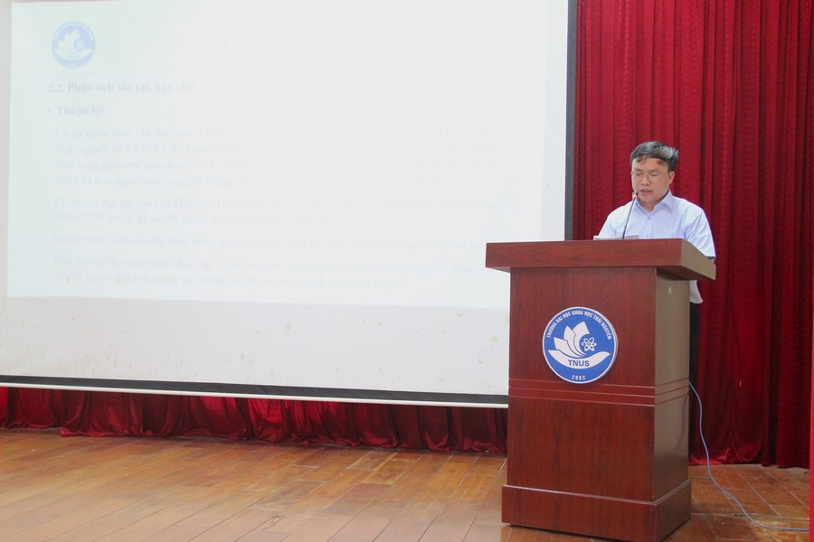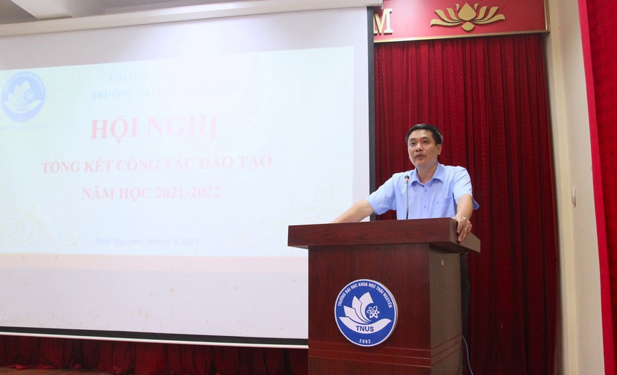 Sau phần phát biểu khai mạc của PGS.TS. Nguyễn Văn Đăng, PGS.TS. Trịnh Thanh Hải – Trưởng Phòng Đào tạo trình bày báo cáo tổng kết công tác đào tạo của Trường năm học 2021 – 2022 và nhiệm vụ, kế hoạch đào tạo năm học 2022 - 2023. Báo cáo đã khái quát về những thành tích nổi bật trong năm học vừa qua, về công tác giảng dạy, kiểm định chất lượng, công tác tuyển sinh và hoạt động nghiên cứu khoa học. Ngoài ra, báo cáo cũng chỉ ra những mặt hạn chế cần khắc phục trong thời gian tới, đồng thời đưa ra định hướng, nhiệm vụ cụ thể cần thực hiện trong năm học 2022- 2023.