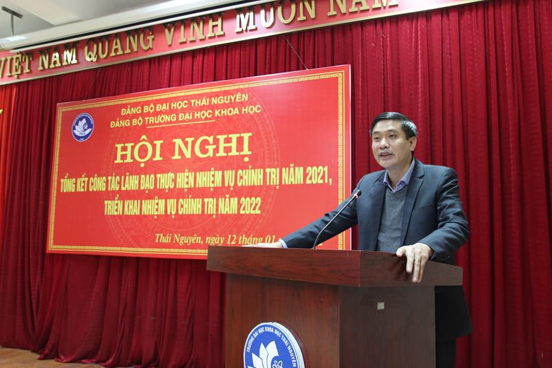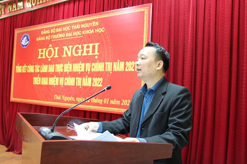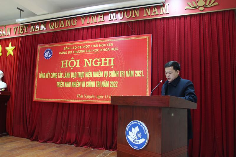 Trong khuôn khổ Hội nghị, PGS.TS. Nguyễn Văn Đăng - Bí thư Đảng ủy, Hiệu trưởng Nhà trường đã thay mặt Ban Chấp hành Đảng bộ thông qua Báo cáo kết quả thực hiện nhiệm vụ năm 2021, phương hướng nhiệm vụ trọng tâm năm 2022. Báo cáo nêu rõ: Trong năm vừa qua, dù đối mặt với rất nhiều khó khăn thách thức do đại dịch COVID-19, nhưng nhờ sự đoàn kết, thống nhất trong toàn Đảng bộ cùng với sự chỉ đạo sáng suốt, kịp thời của Đảng bộ Đại học Thái Nguyên, Đảng bộ Trường ĐHKH đã vượt qua khó khăn và gặt hái được nhiều thành tựu đáng khích lệ.