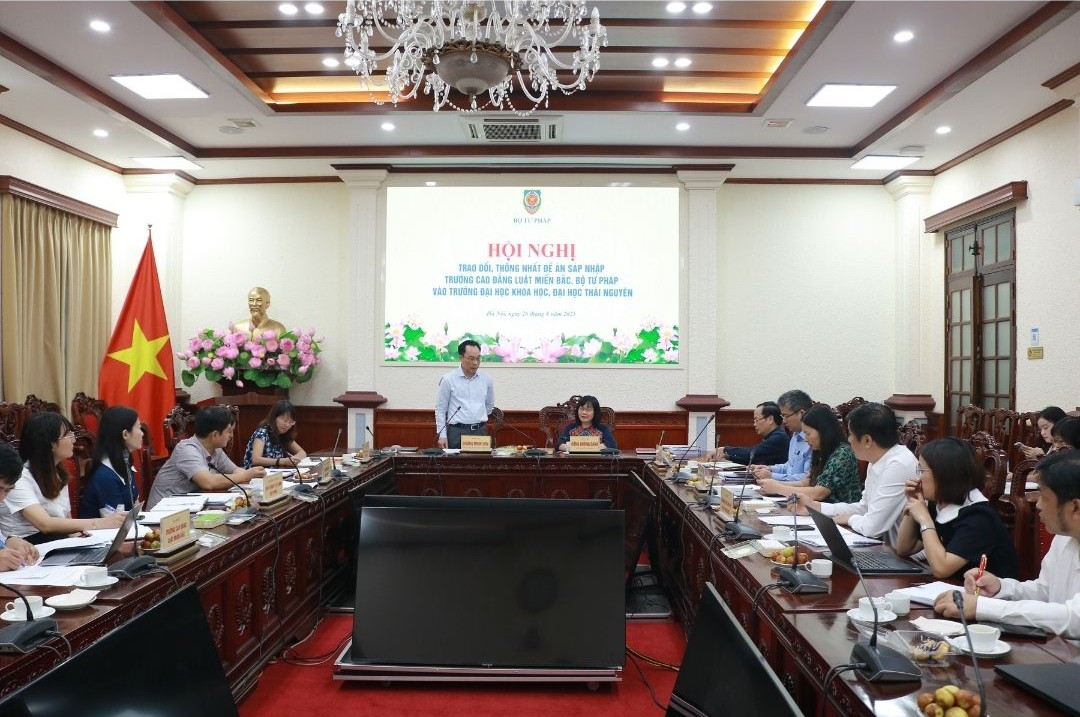 Sáng ngày 26/8, tại trụ sở Bộ Tư pháp, Bộ Giáo dục và Đào tạo cùng Bộ Tư pháp tổ chức Hội nghị trao đổi, thống nhất Đề án sáp nhập Trường Cao đẳng Luật miền Bắc, Bộ Tư pháp vào Trường Đại học Khoa học, Đại học Thái Nguyên.