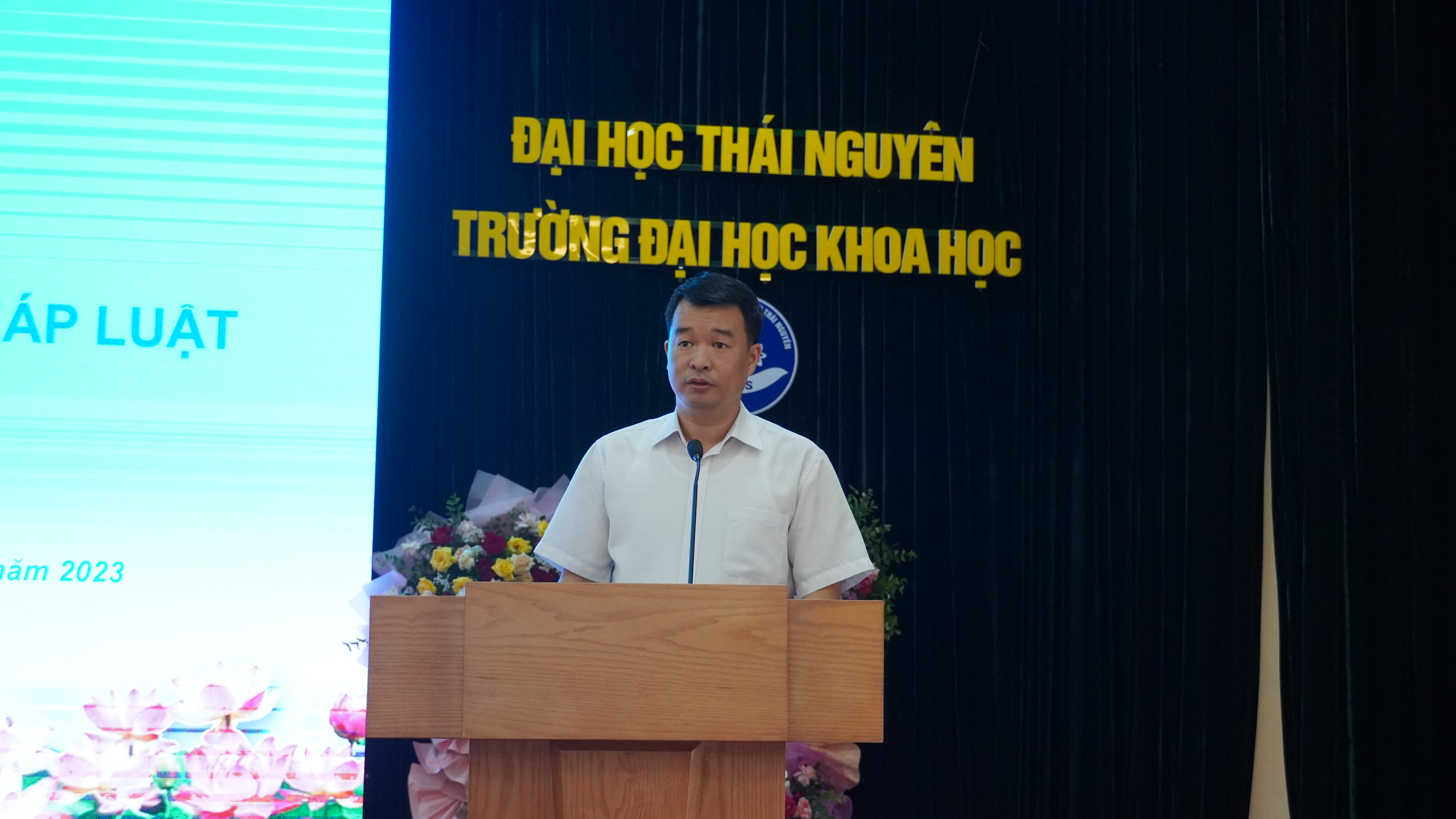 Mở đầu buổi hội nghị, thay mặt cho lãnh đạo Nhà trường, PGS.TS. Ngô Văn Giới – Chủ tịch Hội đồng trường đã phát biểu chỉ đạo hội nghị. PGS.TS. Ngô Văn Giới nhấn mạnh về tầm quan trọng của công tác pháp chế trong trường đại học nói chung và Trường ĐHKH nói riêng; quán triệt toàn thể CBVC, NLĐ Nhà trường cần nắm bắt, hiểu rõ các quy định pháp luật của Nhà nước về công tác giáo dục, đào tạo, từ đó thực hiện đúng, đầy đủ các quy định nói trên.