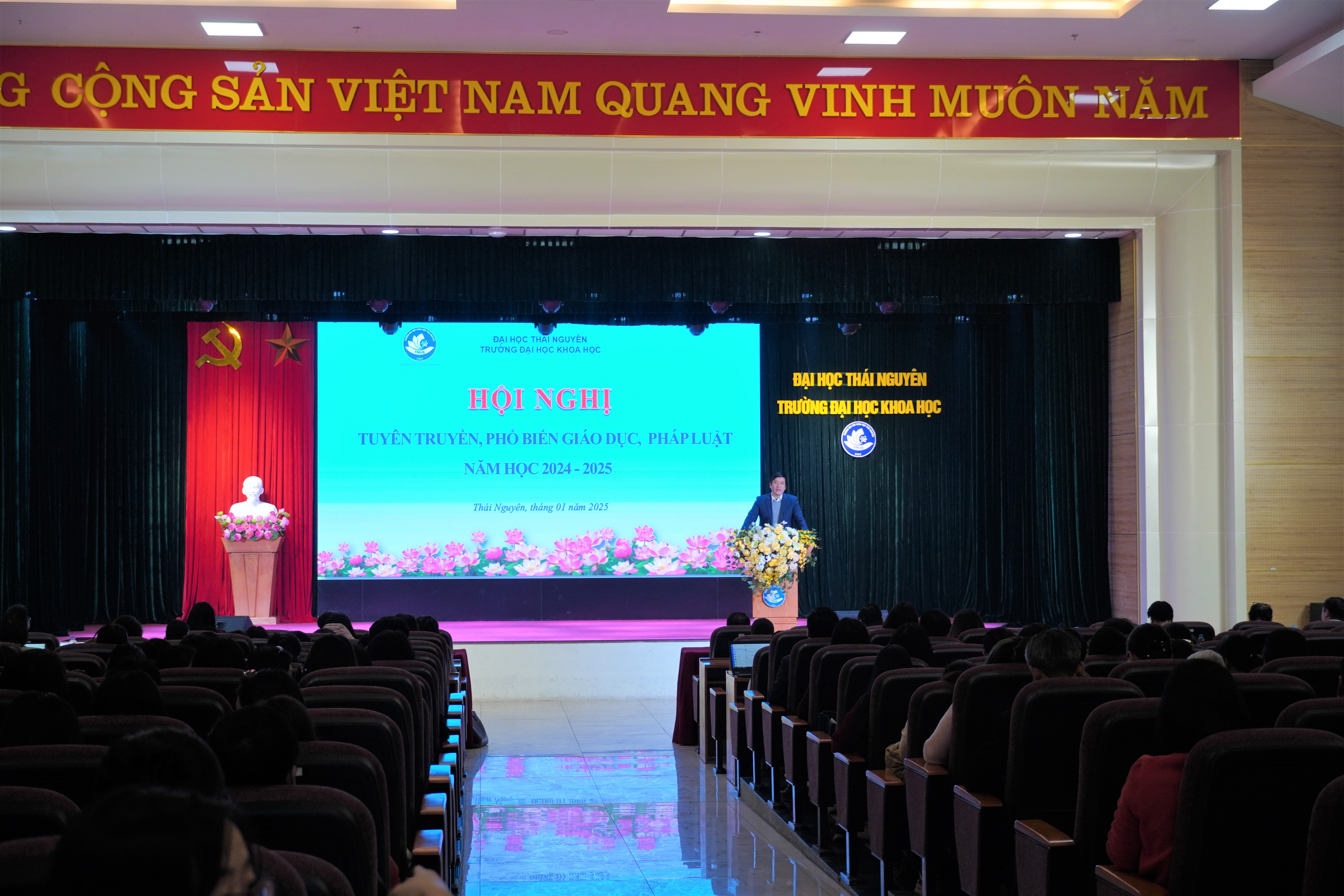 Ngày 20/01/2025, Trươờng ĐHKH tổ chức Hội nghị tuyên truyền, phổ biến giáo dục pháp luật năm học 2024-2025 với mục tiêu phổ biến, quán triệt, trao đổi nội dung các văn bản pháp luật hiện hành và nâng cao năng lực, kỹ năng, nghiệp vụ chuyên môn cho viên chức, người lao động trong Nhà trường.