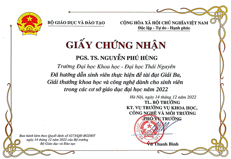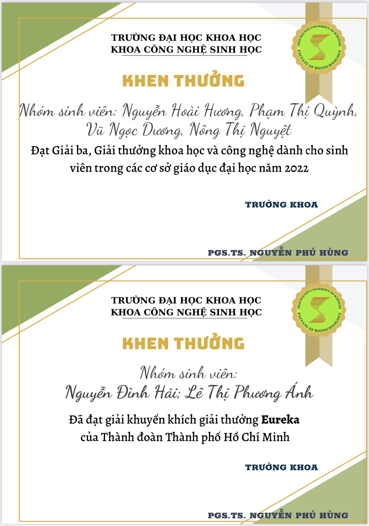 Phát biểu tại buổi trao thưởng, PGS.TS. Nguyễn Phú Hùng – Trưởng Khoa Công nghệ Sinh học đã chúc mừng và nhắn nhủ tới các em sinh viên: Hãy tiếp tục cùng thi đua học tập “rèn đức, luyện tài”, theo đuổi và nuôi dưỡng đam mê học tập, nghiên cứu khoa học bởi mỗi đề tài tham dự Giải thưởng và các bạn sinh viên được vinh danh hôm nay, dù thứ hạng cao hay thấp, đều mang trong mình một giá trị riêng và đáng được tôn vinh.