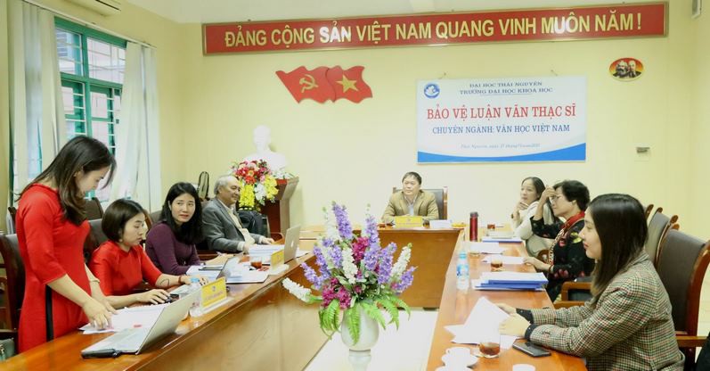 Tham dự buổi bảo vệ có đầy đủ các thành viên trong Hội đồng chấm luận văn Thạc sĩ của chuyên ngành Văn học Việt Nam. Hội đồng chấm luận văn Thạc sĩ gồm các chuyên gia, nhà khoa học và giảng viên là Giáo sư, Phó giáo sư, Tiến sĩ có nhiều kinh nghiệm và kiến thức chuyên sâu trong các lĩnh vực của đề tài như: GS. TS Trần Nho Thìn (Trường Đại học KHXH & NV – ĐH Quốc gia Hà Nội), PGS. TS Nguyễn Đăng Điệp (Viện Văn học), PGS. TS Vũ Thanh (Viện Văn học), PGS. TS Nguyễn Thị Huế (Viện Văn học), PGS. TS Trần Thị Việt Trung (Nhà xuất bản Đại học Thái Nguyên), PGS. TS. Nguyễn Đức Hạnh (Đại học Thái Nguyên), PGS. TS Phạm Thị Phương Thái (Trường Đại học Khoa học), PGS. TS CaoThị Hồng (Hội Văn học Nghệ thuật tỉnh Thái Nguyên) và các giảng viên trong Bộ môn Ngữ Văn và Văn hóa Việt Nam của Khoa Ngôn ngữ và Văn hoá.