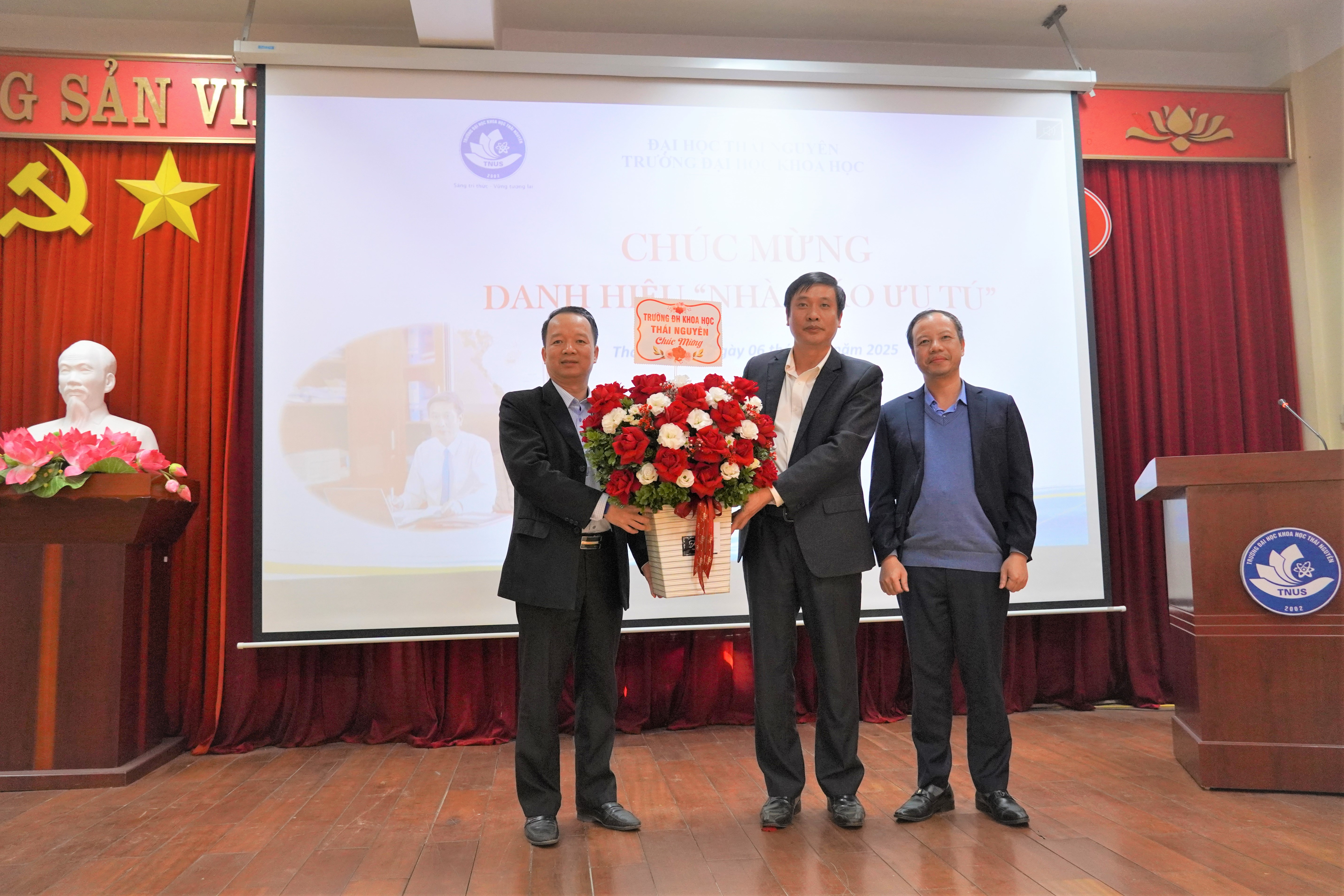 Ảnh 1: Lãnh đạo Nhà trường tặng hoa chúc mừng PGS.TS. Nguyễn Văn Đăng được phong tặng danh hiệu NGƯT năm 2024
