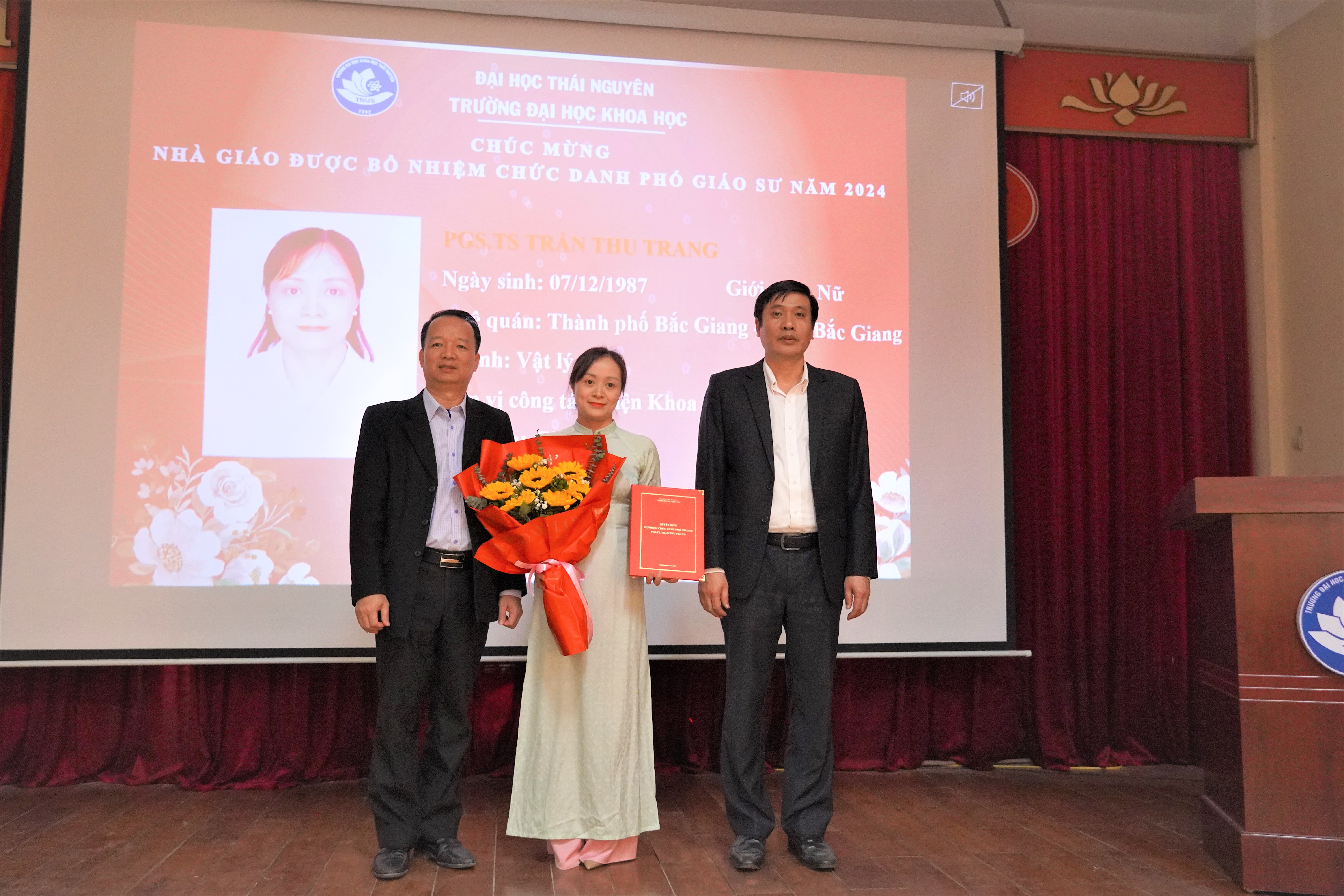 Ảnh 2: PGS.TS. Nguyễn Văn Đăng và PGS.TS. Ngô Văn Giới trao quyết định công nhận PGS và tặng hoa chúc mừng Tân PGS trẻ Trần Thu Trang