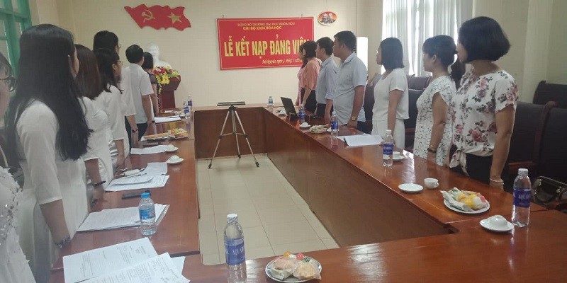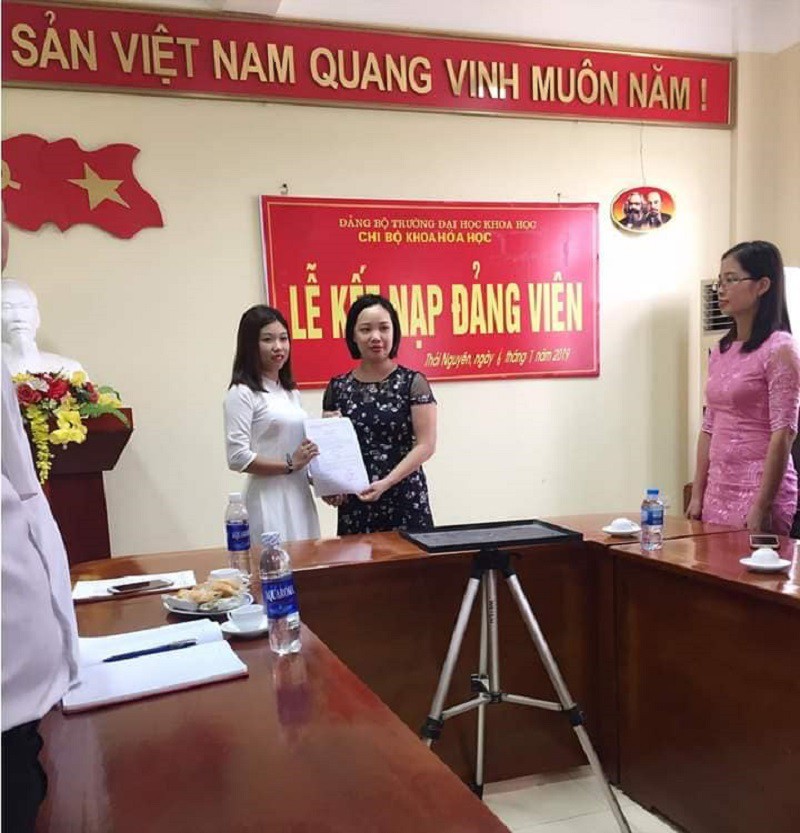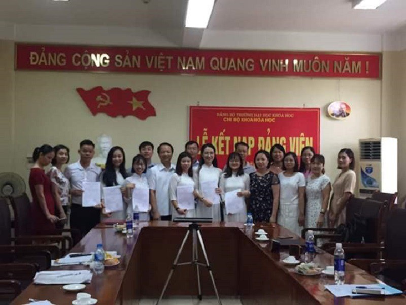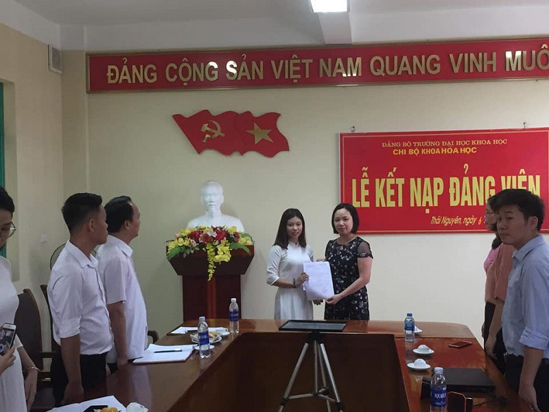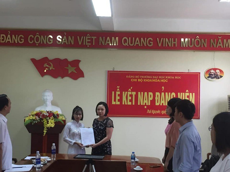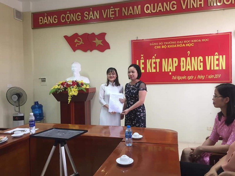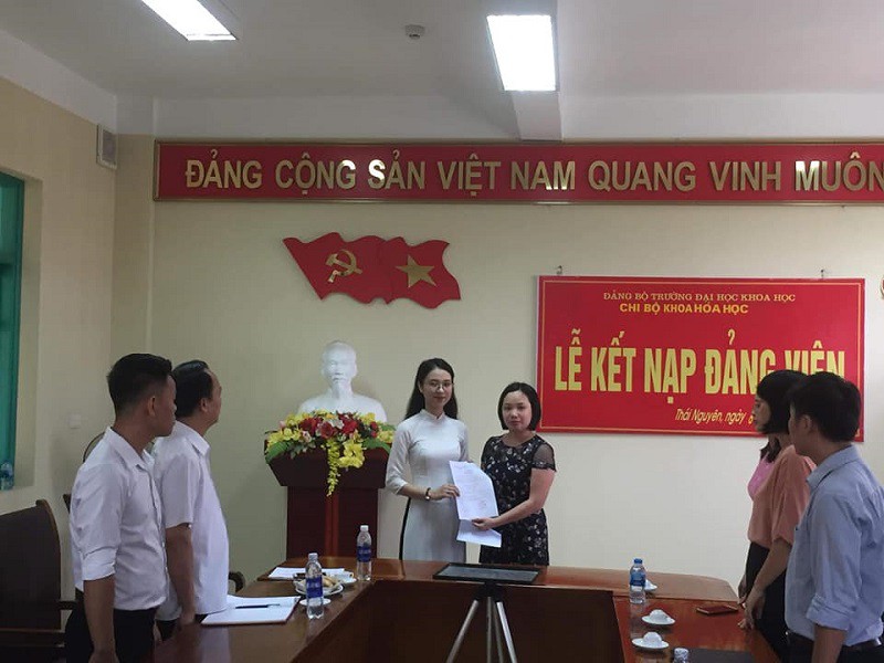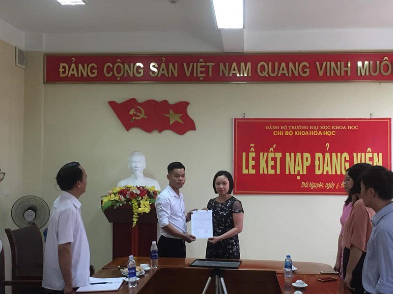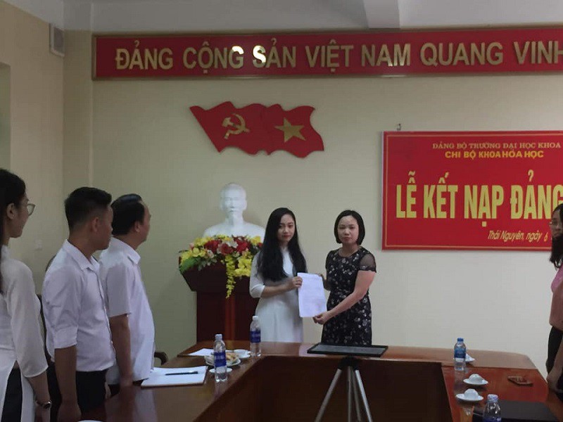 Sau nghi lễ chào cờ, Phó Bí thư chi bộ khoa Hóa học đã lần lượt đọc và trao quyết định kết nạp đảng viên mới cho từng quần chúng ưu tú trước sự chứng kiến của toàn bộ Đảng viên trong chi bộ. Tại lễ kết nạp, các đồng chí đảng viên mới đều lần lượt đọc lời tuyên thệ, hứa nguyện trung thành với lý tưởng và mục tiêu cách mạng của Đảng, thực hiện nghiêm túc các nhiệm vụ của người đảng viên, đóng góp tích cực vào việc xây dựng Đảng, xứng đáng là đảng viên của Đảng cộng sản Việt Nam.