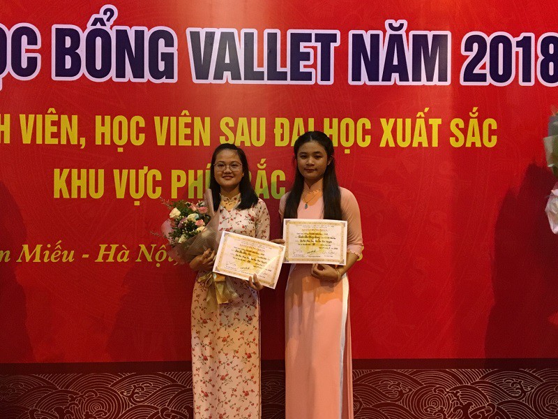 Sinh viên Đào Thị Thu Hà (bên trái) trong lễ trao học bổng Vallet 2018 tại Văn miếu Quốc Tử Giám.