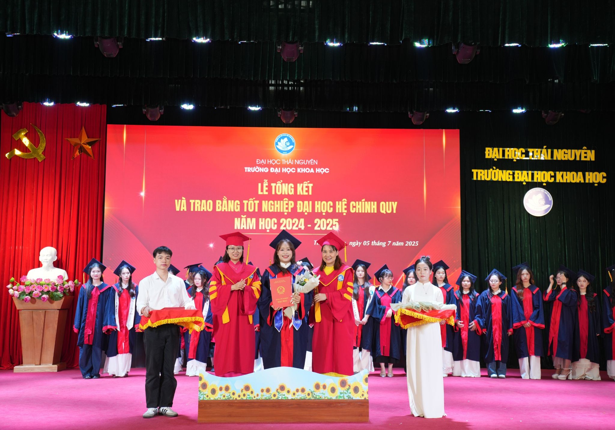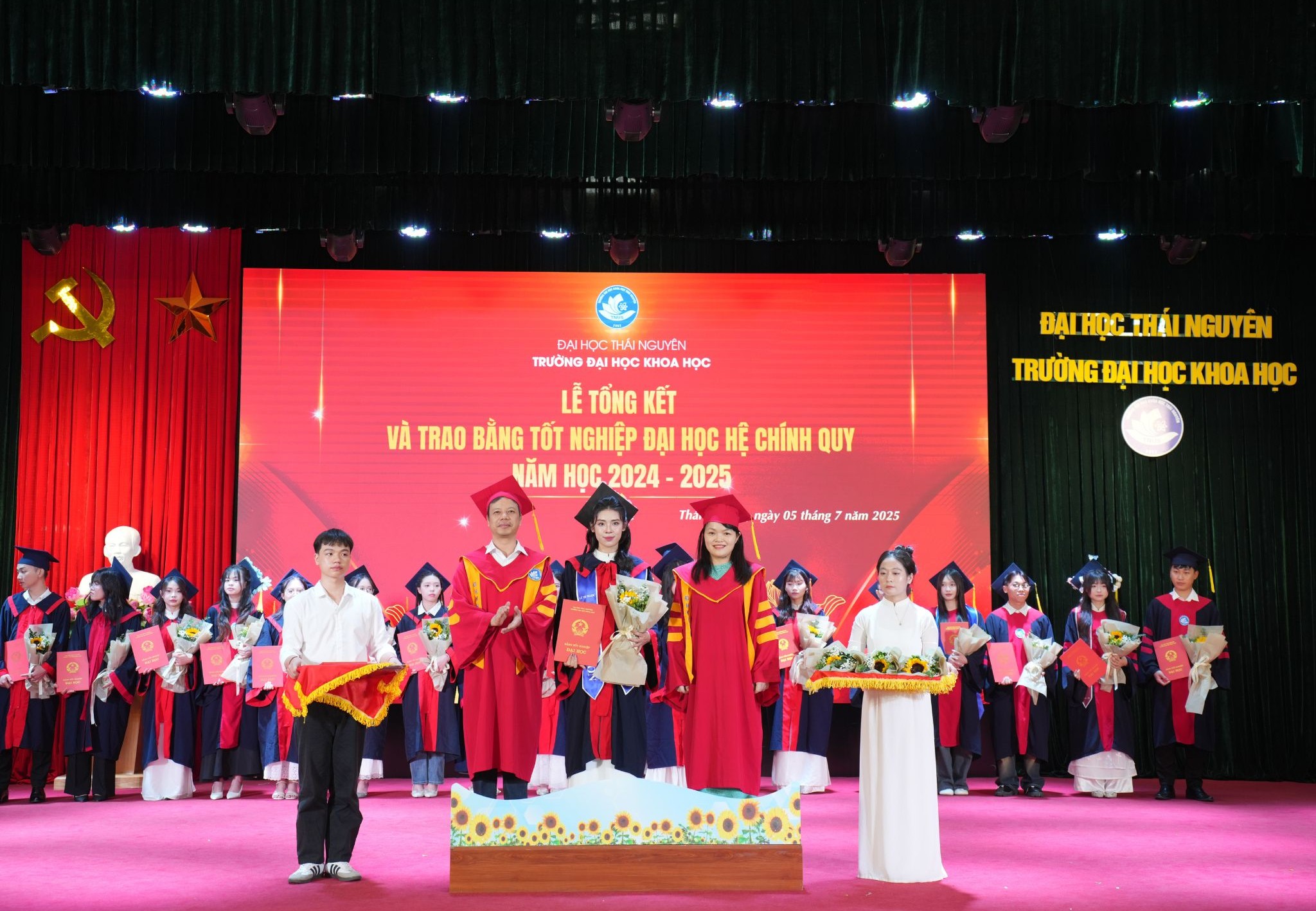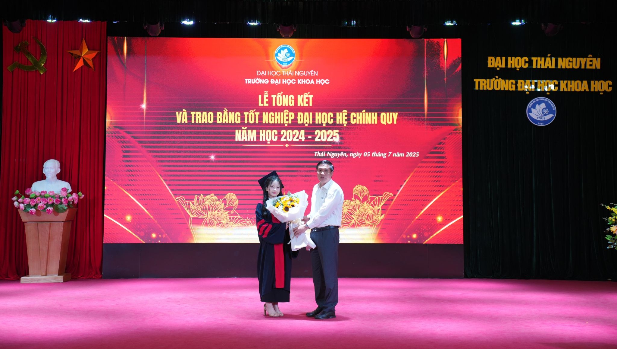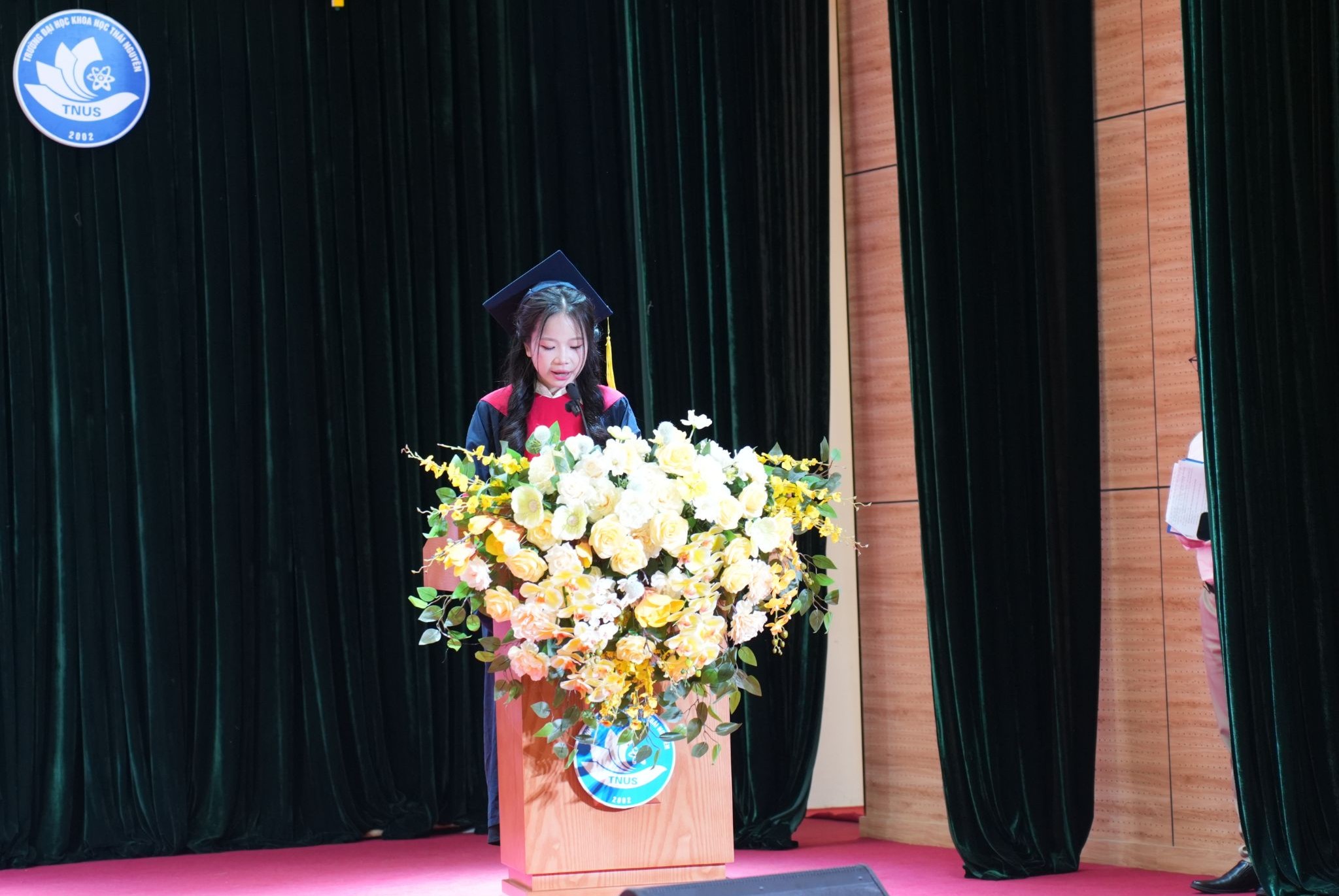Đại diện các tân cử nhân, sinh viên Hứa Thị Dự - lớp Trung Quốc học K19A - Thủ khoa khoá 19 đã bày tỏ sự tri ân sâu sắc đến Ban Lãnh đạo nhà trường, các khoa, bộ môn, các thầy cô giáo đã luôn đồng hành, động viên, khích lệ trong suốt quá trình học tập và rèn luyện dưới mái trường TNUS trong suốt 4 năm qua. Bạn chia sẻ: ""Lấy khó khăn của bố làm động lực, lấy nụ cười của mẹ làm chỗ dựa, lấy tình yêu thương của thầy cô làm điểm tựa đến thành công, chúng em - những tân cử nhân tốt nghiệp năm 2025 xin hứa sẽ tiếp tục cố gắng, nỗ lực hơn nữa để chinh phục tri thức và trở thành những người công dân có ích cho quê hương, đất nước."