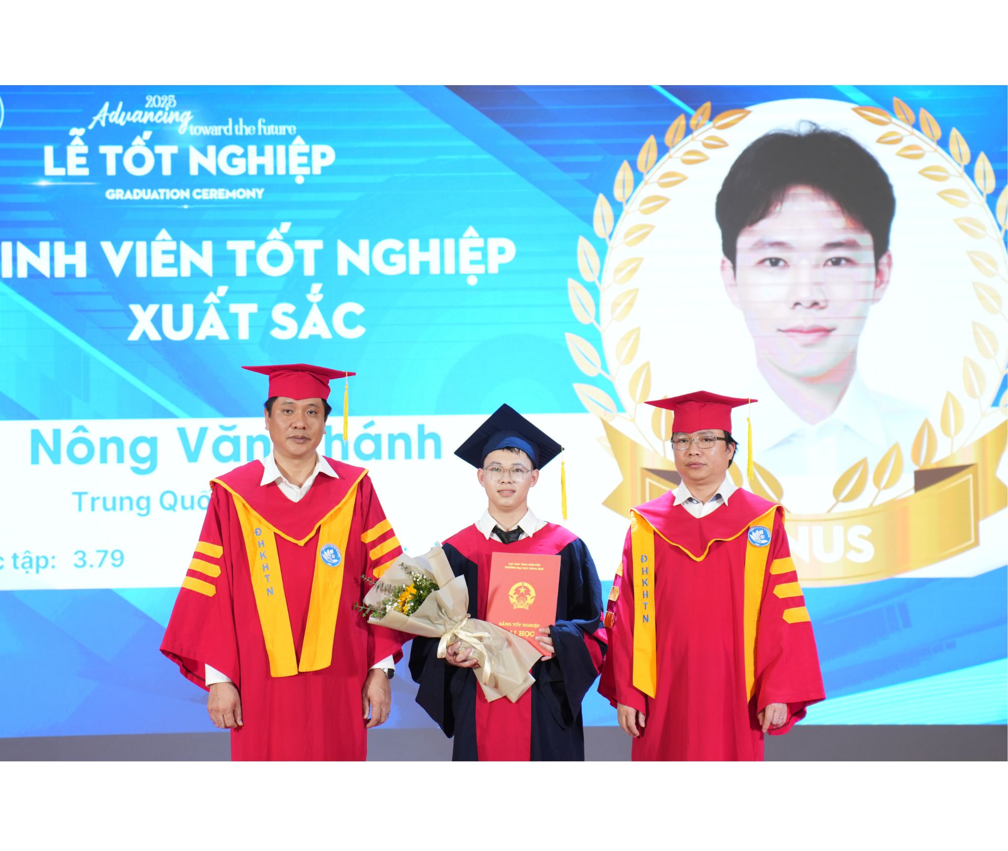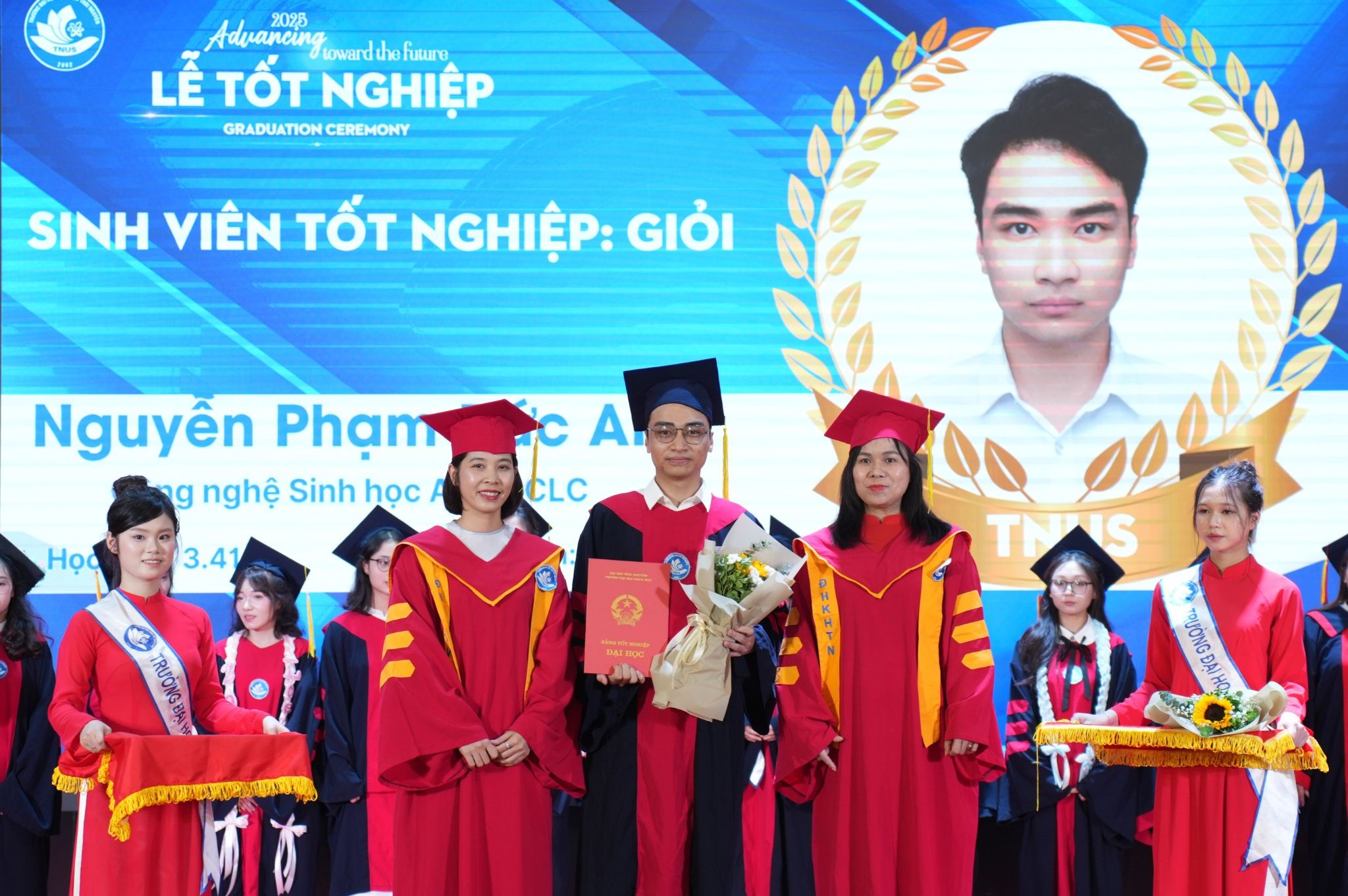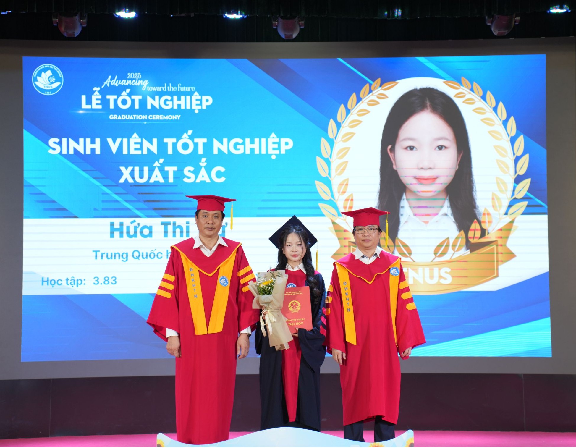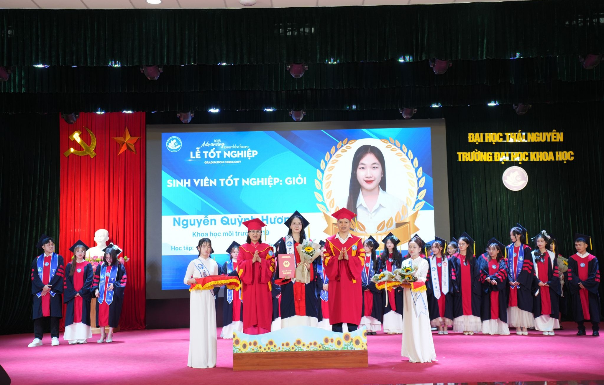 Đại diện các tân cử nhân, sinh viên Hứa Thị Dự - lớp Trung Quốc học K19A - Thủ khoa khoá 19 đã bày tỏ sự tri ân sâu sắc đến Ban Lãnh đạo nhà trường, các khoa, bộ môn, các thầy cô giáo đã luôn đồng hành, động viên, khích lệ trong suốt quá trình học tập và rèn luyện dưới mái trường TNUS trong suốt 4 năm qua. Bạn chia sẻ: ""Lấy khó khăn của bố làm động lực, lấy nụ cười của mẹ làm chỗ dựa, lấy tình yêu thương của thầy cô làm điểm tựa đến thành công, chúng em - những tân cử nhân tốt nghiệp năm 2025 xin hứa sẽ tiếp tục cố gắng, nỗ lực hơn nữa để chinh phục tri thức và trở thành những người công dân có ích cho quê hương, đất nước."