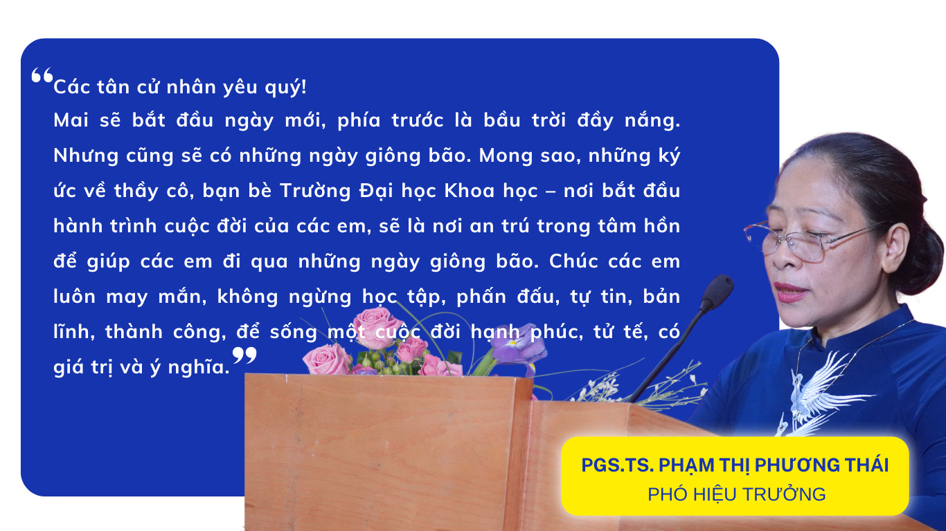 “Đứng trên sân khấu lễ tốt nghiệp, nhìn quanh những gương mặt rạng rỡ của các bạn sinh viên, tôi không khỏi cảm thấy xúc động và tự hào. Sau 4 năm miệt mài học tập, chúng tôi đã cùng nhau vượt qua biết bao thử thách, và giờ đây, chúng tôi đã trở thành những Tân cử nhân của TNUS.
