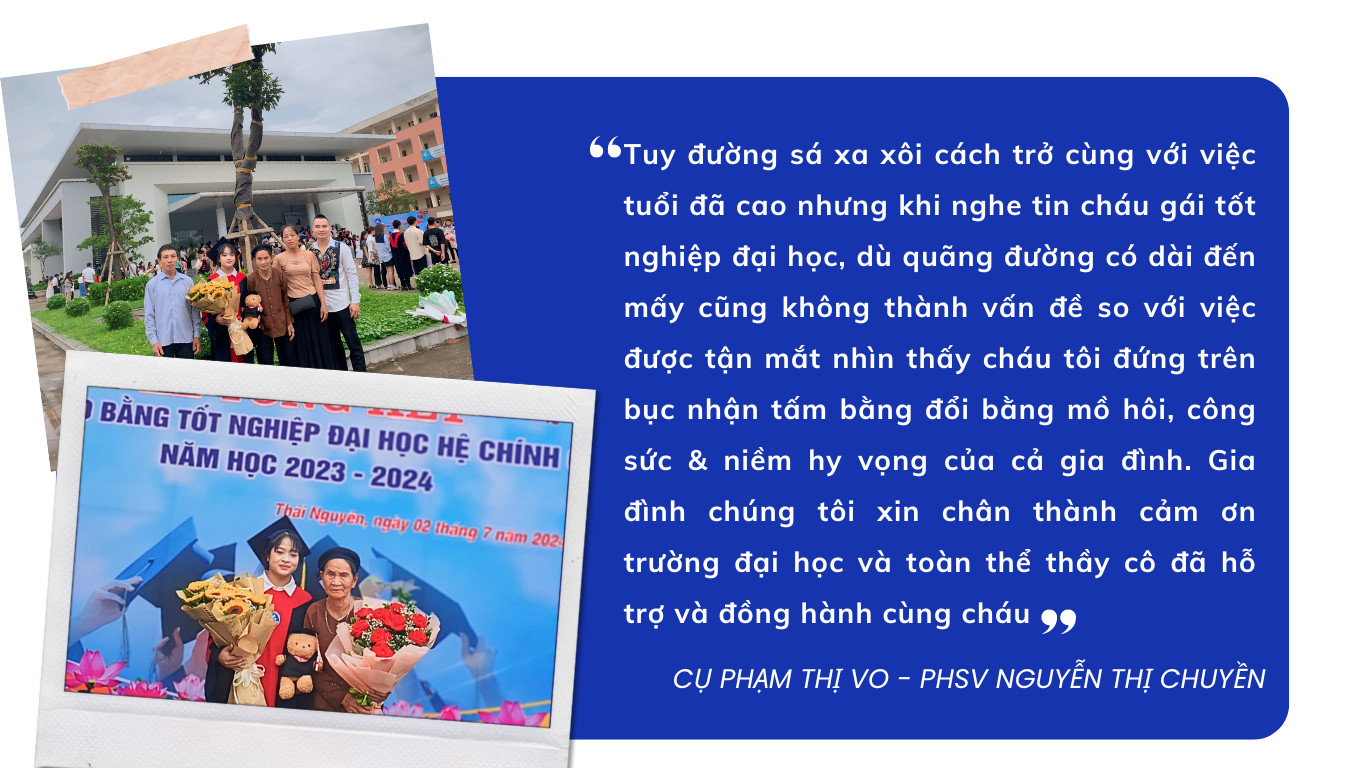 Khi nhìn thấy cháu mình đứng trên bục nhận bằng tốt nghiệp, bà Phạm Thị Vo đã xúc động chia sẻ “Tuy đường sá xa xôi cách trở cùng với việc tuổi đã cao nhưng khi nghe tin cháu gái tốt nghiệp đại học, dù quãng đường có dài đến mấy cũng không thành vấn đề so với việc được tận mắt nhìn thấy cháu tôi đứng trên bục nhận tấm bằng đổi bằng mồ hôi, công sức & niềm hy vọng của cả gia đình. Gia đình chúng tôi xin chân thành cảm ơn trường đại học và toàn thể thầy cô đã hỗ trợ và đồng hành cùng cháu”.