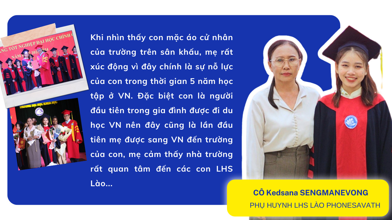 Khi nhìn thấy con mặc áo cử nhân của trường trên sân khấu, mẹ rất xúc động vì đây chính là sự nỗ lực của con trong thời gian 5 năm học tập ở VN. Đặc biệt con là người đầu tiên trong gia đình được đi du học VN. Và đây cũng là lần đầu tiên mẹ được sang VN đến trường của con, một ngôi trường khang trang. Mẹ cảm thấy nhà trường rất quan tâm đến các con LHS Lào. Con đã phải vượt qua rất nhiều thử thách khi học tập ở một môi trường mới, với ngôn ngữ và văn hóa khác biệt. Nhưng với sự cố gắng và quyết tâm của con, cùng với sự hỗ trợ của nhà trường và các thầy cô, con đã vượt qua mọi khó khăn và đạt được thành tích học tập tốt. Mẹ cũng vừa hạnh phúc vừa buồn khi nhìn thấy thầy trò gửi đến nhau những lời chia tay và lời chúc lần cuối cùng. Cảm ơn các thầy cô giáo, cảm ơn Trường đã luôn đồng hành cùng con. Mẹ luôn tự hào về con”.