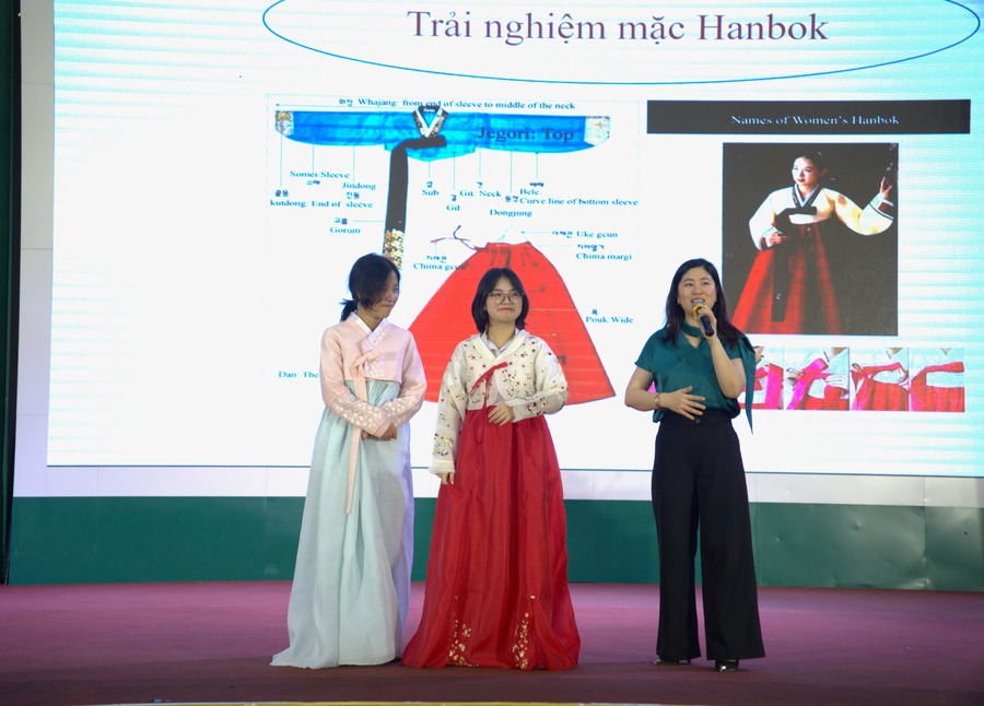 Sự kiện được chia làm 02 phiên sáng và chiều. Trong chương trình ở phiên buổi sáng, các bạn học sinh, sinh viên đã được tìm hiểu về một phần lịch sử, văn hóa đất nước Hàn Quốc thông qua các bài giảng chuyên đề của các giảng viên tới từ Khoa Đông phương học, Trường Đại học Khoa học Xã hội và Nhân văn Hà Nội. Bên cạnh đó, các bạn cũng được trải nghiệm Văn hóa Hàn quốc qua chuỗi hoạt động vô cùng lý thú và bổ ích như: trải nghiệm mặc Hanbok, tự tay gấp Hanbok bằng giấy, các trò chơi dân,… các bạn sinh viên, học sinh đã cùng tham gia tiếp thu văn hóa, trổ tài thủ công và mang về những món quà handmade xinh xắn.