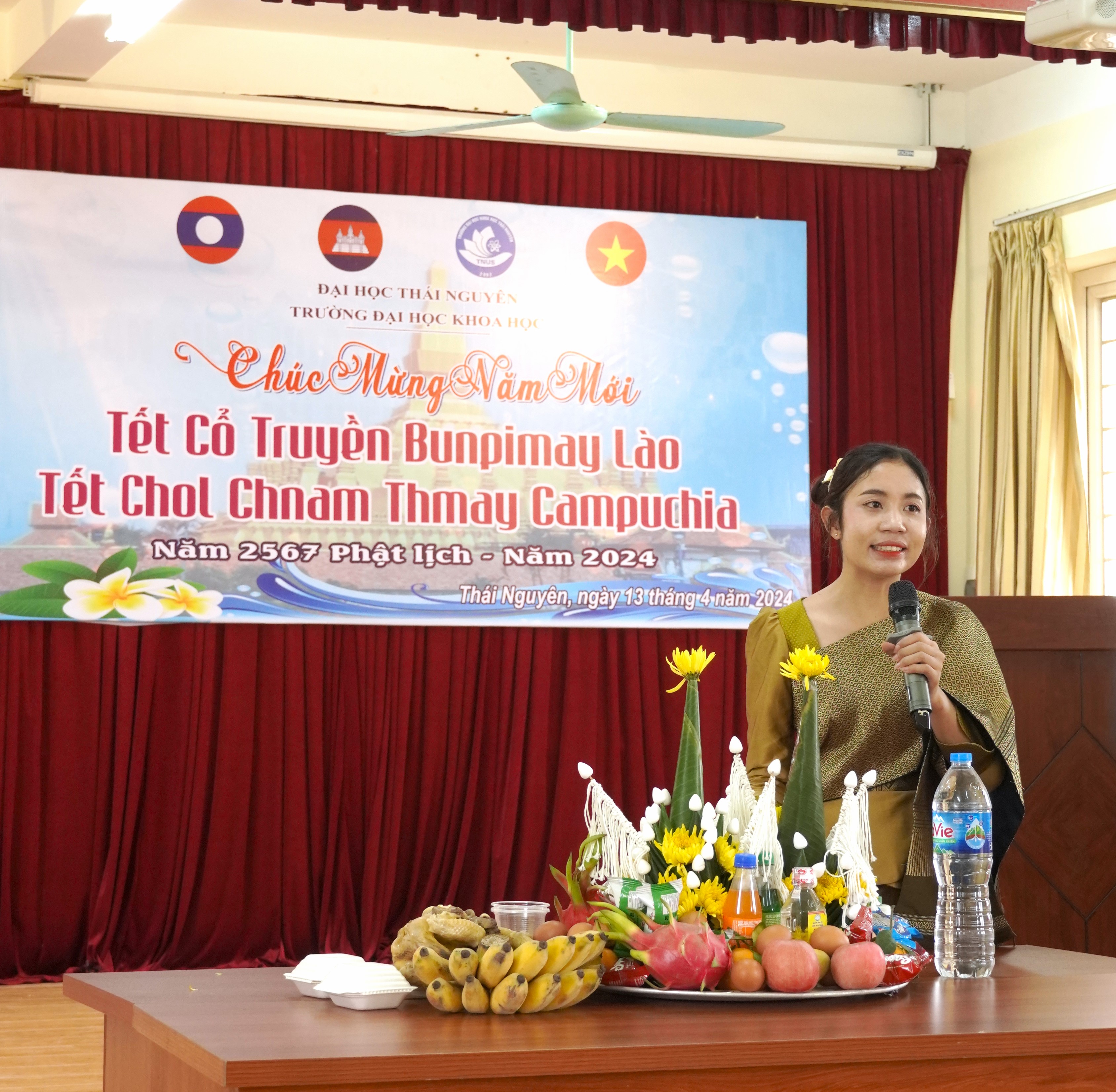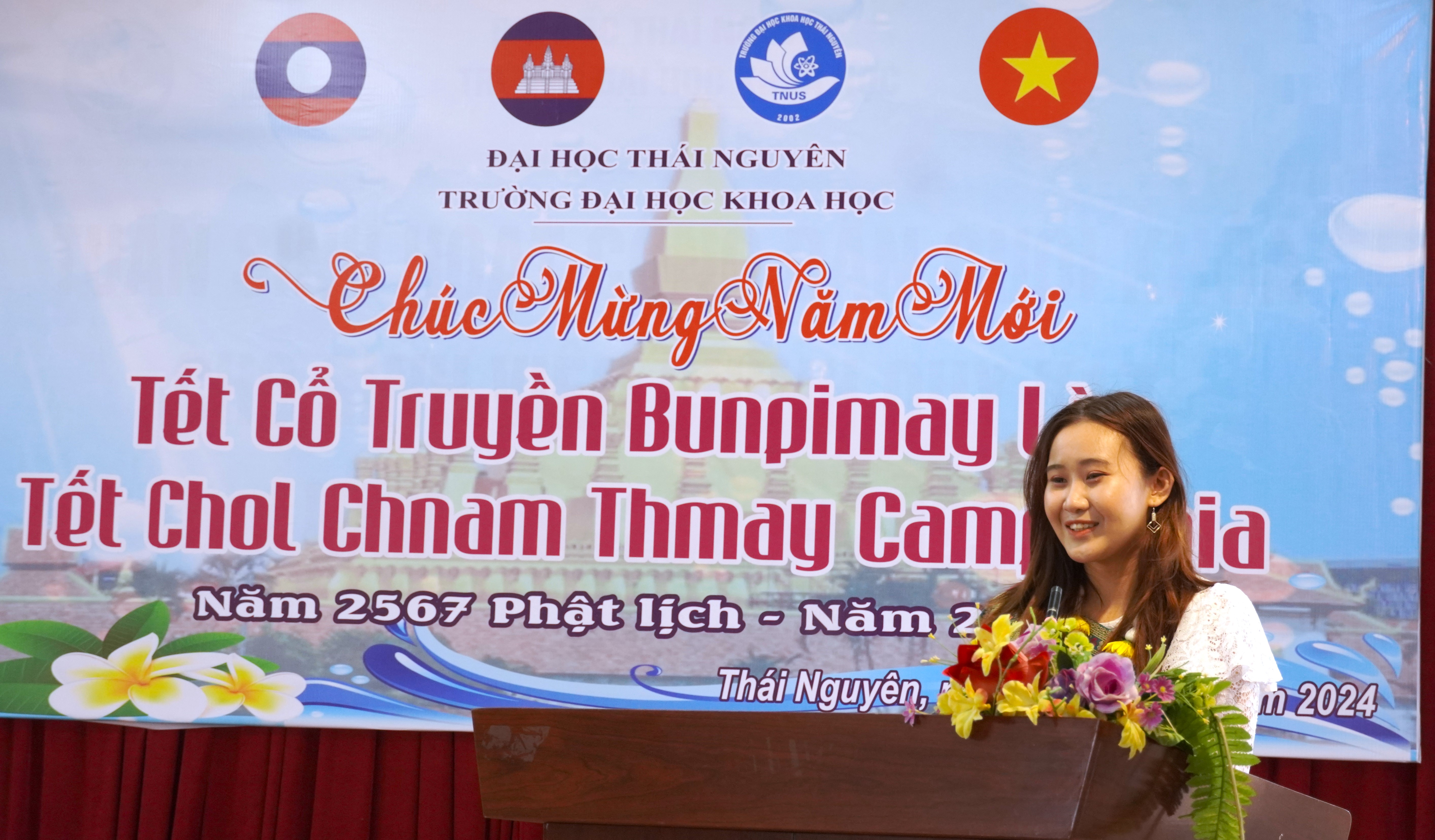Đại diện cho LHS Lào và Campuchia, sinh viên Mone PHOMMAHAXAY – ngành Vât lý đã giới thiệu về ý nghĩa Tết cổ truyền Bunpimay của nước CHDCND Lào và Tết Chol Chnam Thmay của Vương quốc Campuchia tới các thầy cô, các bạn sinh viên. Đồng thời Mone cũng bày tỏ tình cảm, sự trân quý với các thầy cô trong Trường với những lời chúc mừng năm mới tốt đẹp, chân thành