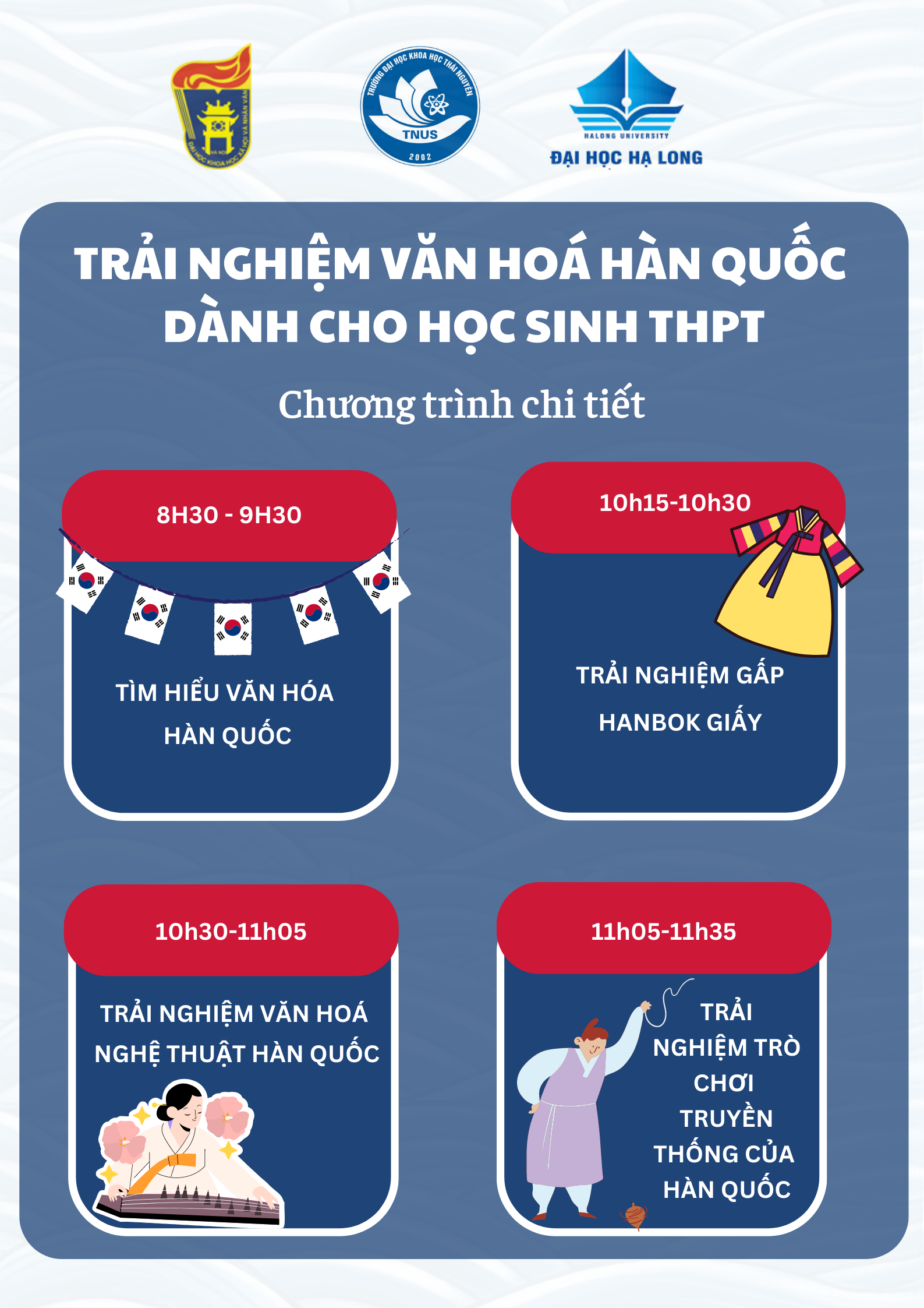 Chương trình được chuẩn bị kỹ lưỡng với nhiều hoạt động vô cùng phong phú và đa dạng: giới thiệu văn hóa truyền thống Hàn Quốc, văn hoá nghệ thuật, gấp Hanbok giấy và chụp ảnh lưu niệm, tham gia các trò chơi truyền thống Hàn Quốc, tọa đàm “ Ngôn ngữ và văn hoá Hàn Quốc dưới góc nhìn của sinh viên Việt Nam”,…