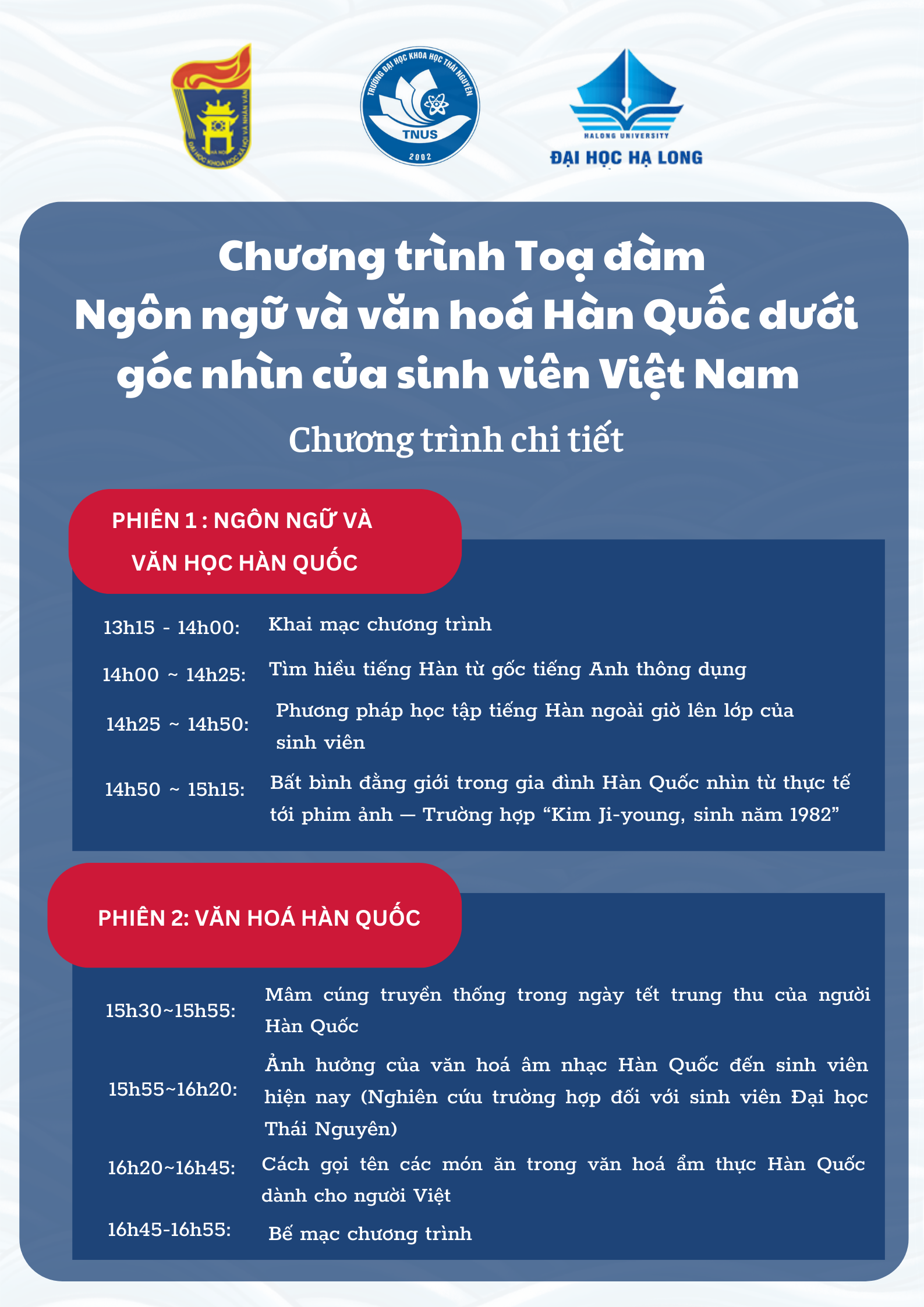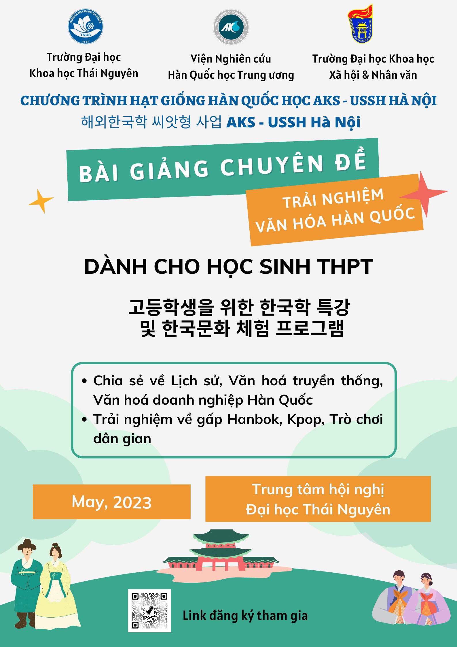Chương trình “Tìm hiểu và trải nghiệm văn hóa Hàn Quốc” và Tọa đàm: “ Ngôn ngữ và văn hoá Hàn Quốc dưới góc nhìn của sinh viên Việt Nam” sẽ diễn ra trong ngày 27/05/2023 tại Trung tâm hội nghị Đại học Thái Nguyên và Hội trường Trường Đại học Khoa học.
